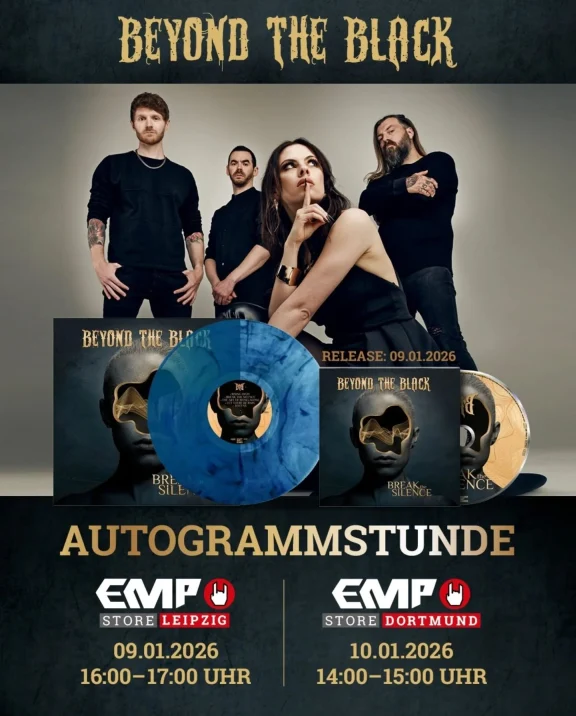 Beyond The Black eröffnen die Signierstunden in den EMP Stores und kommen jeweils nach Leipzig UND nach Dortmund. Am 09.01.2026 ist es von 16:00 bis 17:00 Uhr in Leipzig soweit. Am 10.01.2026 darf dann schon um 14:00 Uhr für ein Autogramm angestanden werden. Auch hier ist nach einer Stunde um 15:00 Uhr Schluss.