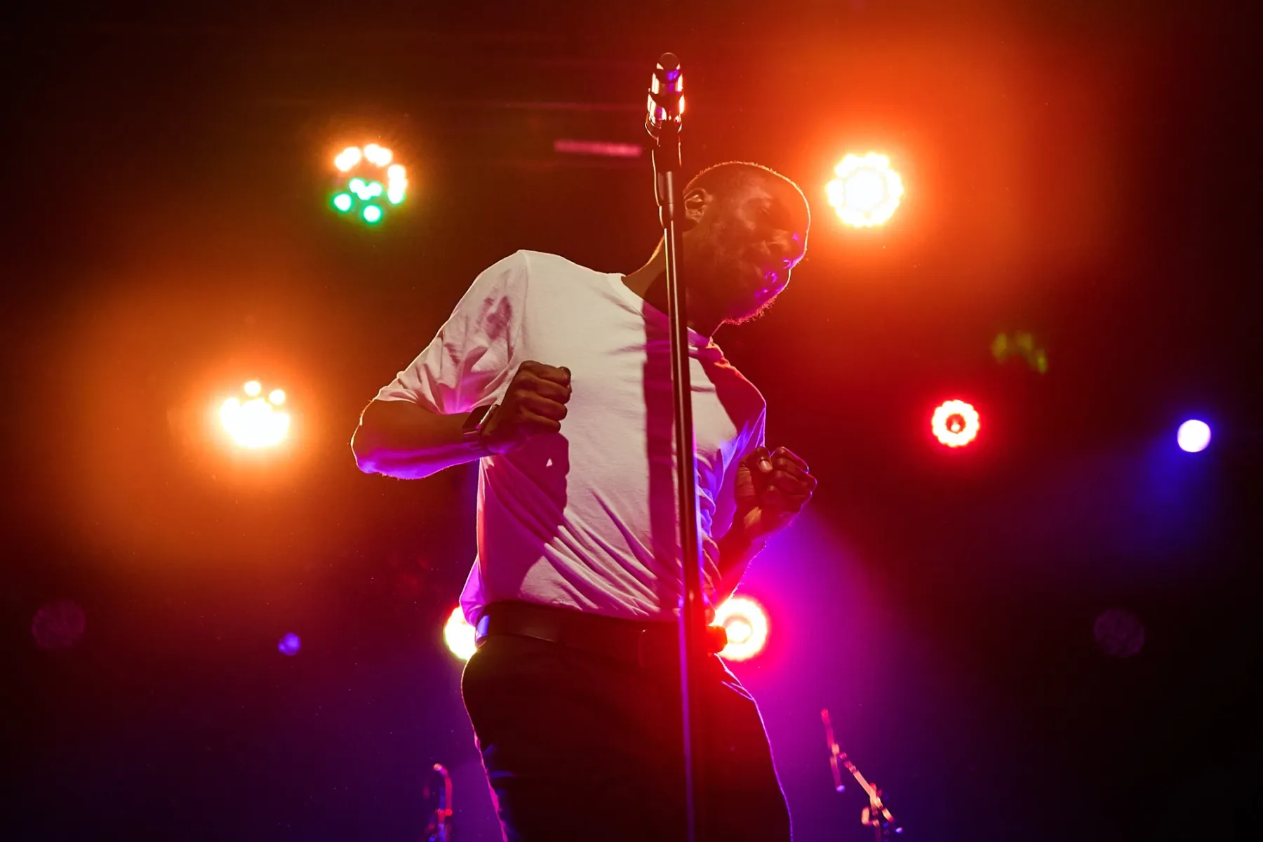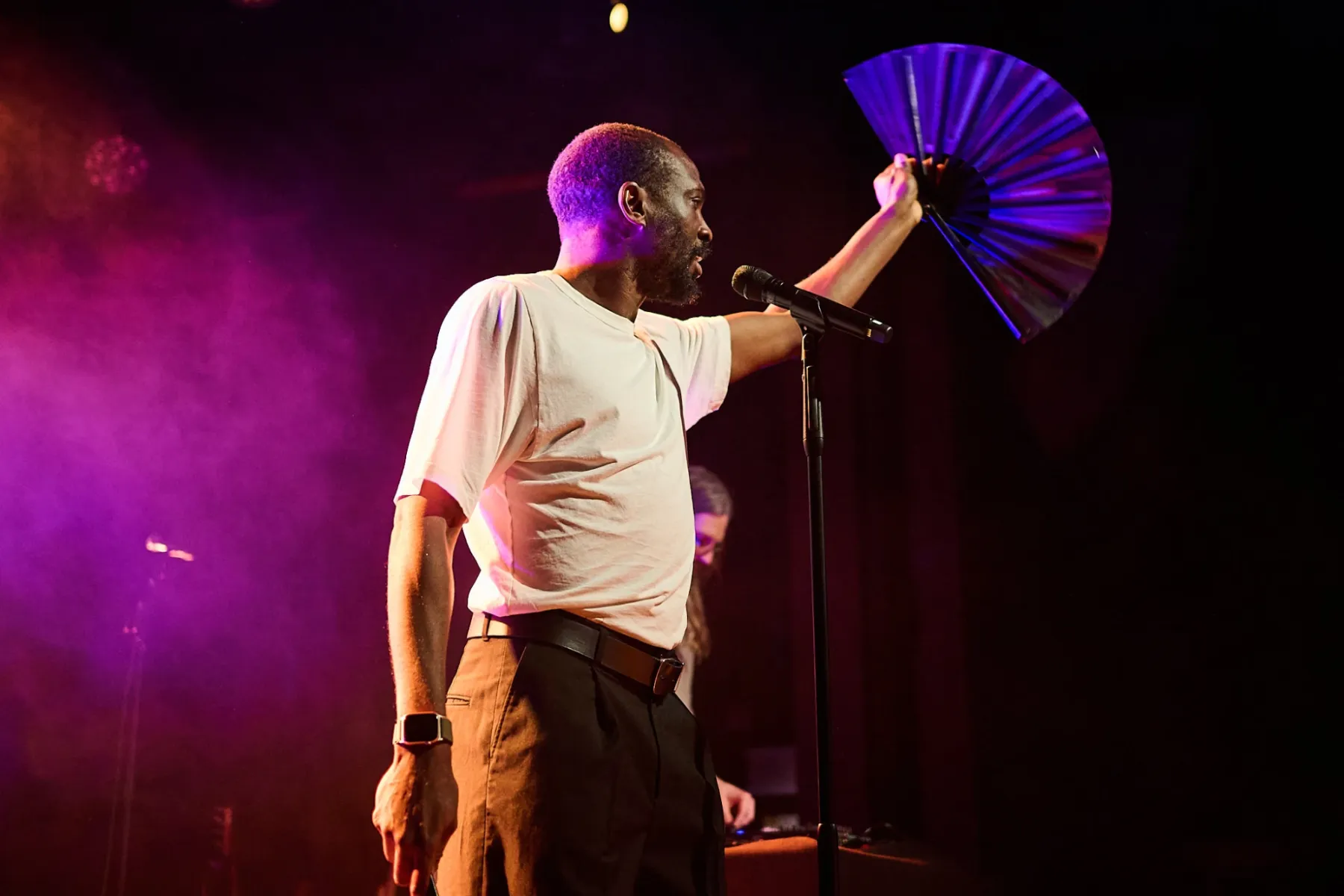 Als Support war Joshua Idehen am Start und er passte perfekt in den schrägen Abend. In seinen Electro-Dance Songs vertont er seine Gedichte und Gedanken („Mum does the washing“), nur mit eleganteren Dance-Moves als Baxter und etwas weniger Schimpfwörtern.