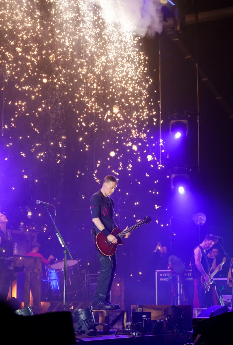 Außerdem bedankten sich der Frontmann und seine Band mehrmals beim Publikum dafür, dass sie auch nach so langer Zeit immer noch auf so eine große Fangemeinde bauen können. Dass sie immer noch Livemusik spielen können und diese die Fans begeistert.