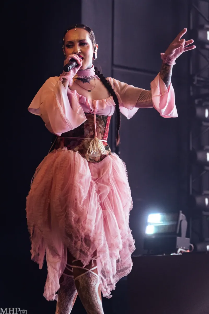 Zu guter Letzt starten dann Jinjer. Von Sekunde eins wird klar, dass Tatiana Shmailyuk nicht nur auf Platte ihre großartige Stimme einsetzen kann, auch live ist ihre Stimme die mühelos von tiefstem Growlen auf glaskaren Gesang wechselt ein Highlight des Konzerts. Aber auch die Instrumentalfraktion mit Roman Ibramchalilow an der Gitarre und Eugene Abdjuchanow am Bass, sowie Wlad Ulassewytsch an den Drums sind Skilltechnisch ganz weit vorne. Der Mix aus Djent, Progressive-, Groove-, Deathmetal und Metalcore ist wirklich einzigartig und macht den Sound von Jinjer einzigartig. Optisch unterstützt wird der Auftritt von einer riesigen Video-LED-Wand im Hintergrund, auf der zu den Songs passende Animationen laufen, nicht nur akustisch beeindruckend, auch optisch sehr stark. Das Publikum feiert Jinjer mit Moshpits und Crowdsurfern, die wie üblich im Schlachthof, sicher von der Security aufgefangen werden. Starkes Konzert!