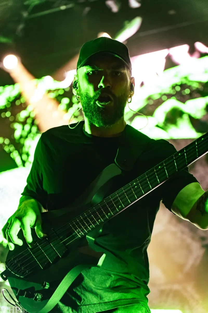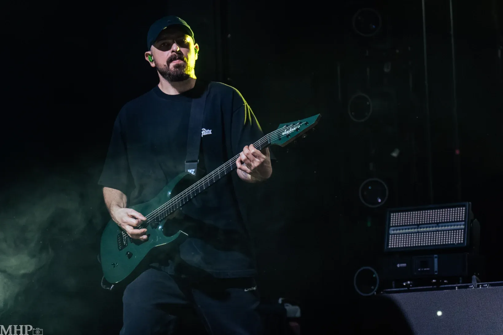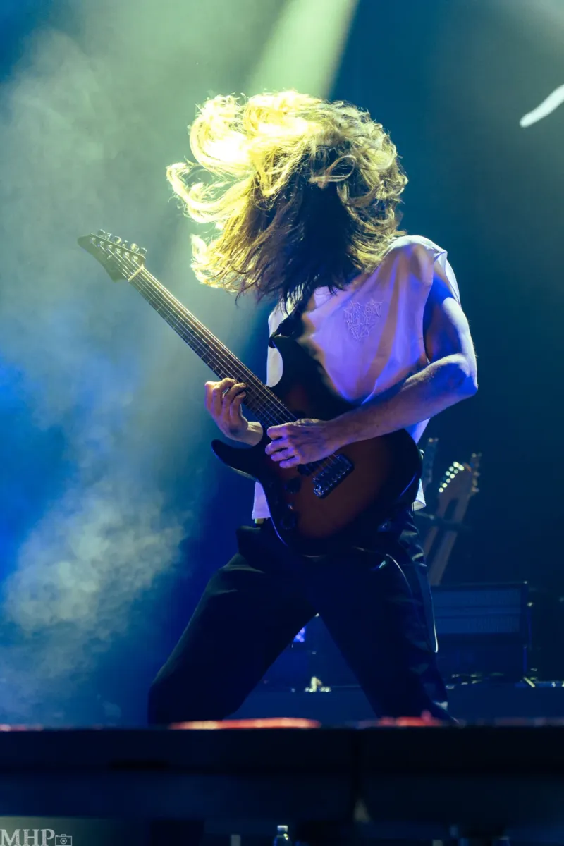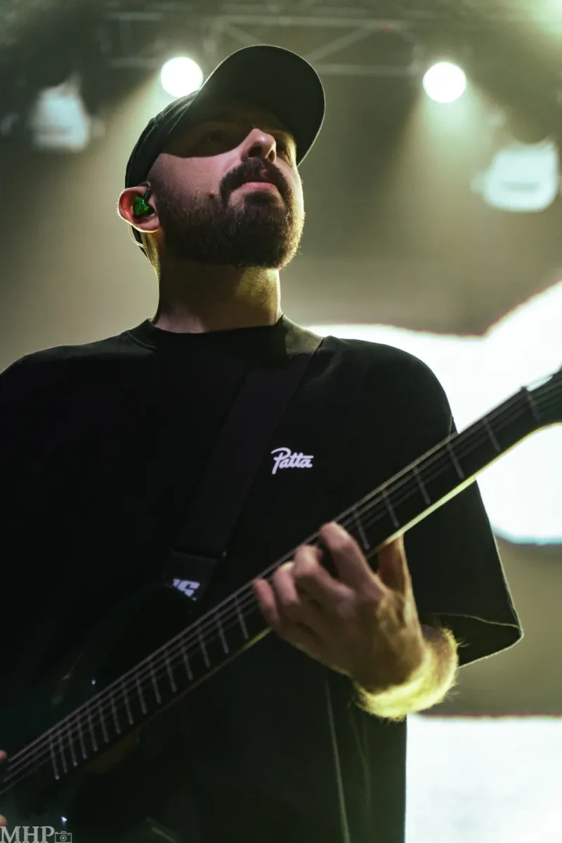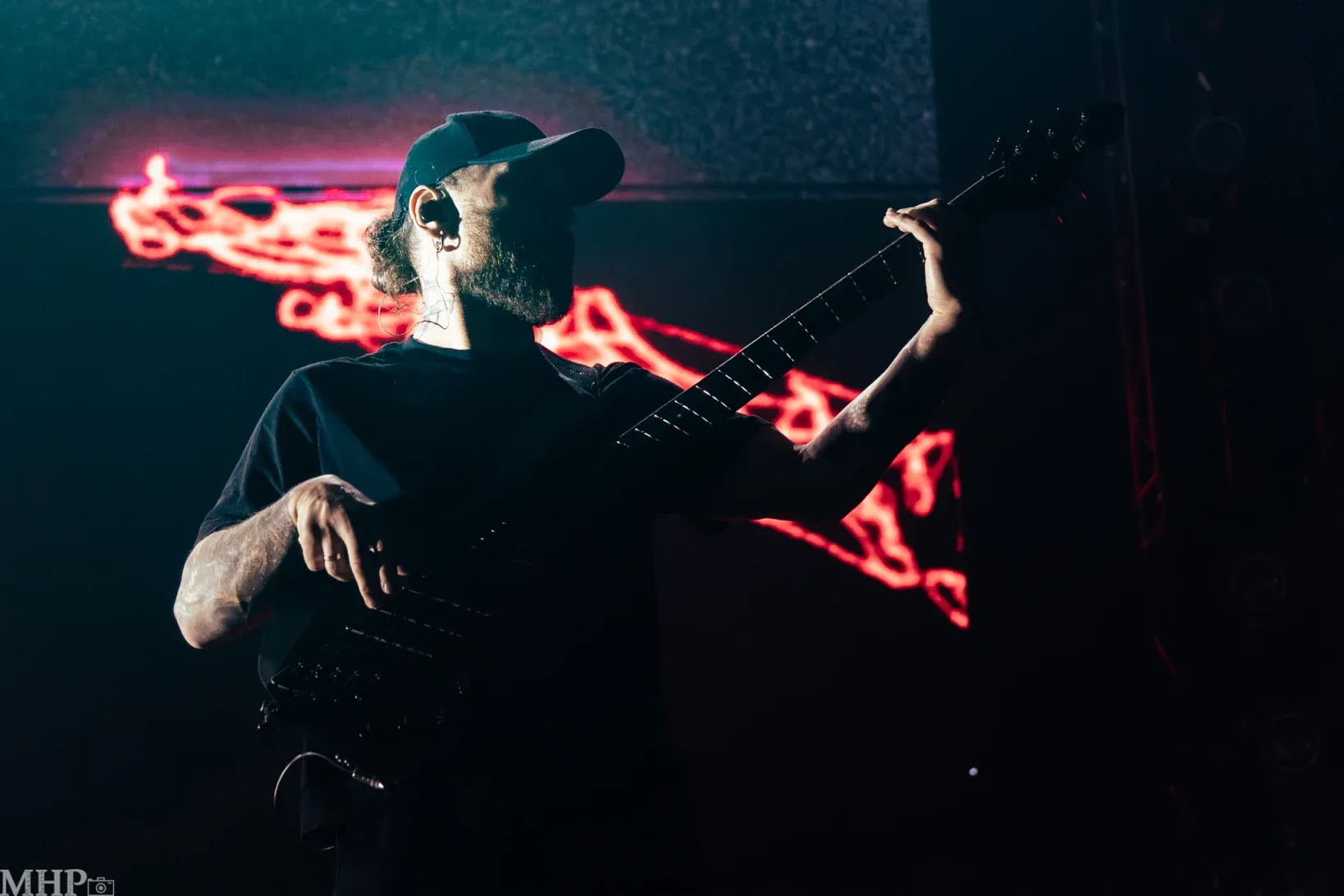 Zuerst betreten die Niederländer von Textures die Bühne im Schlachthof Wiesbaden – die Halle ist bereits gut gefüllt. Von der Security erfährt man, dass bis auf wenige Tickets die Halle fast ausverkauft ist. Die 2001 gegründete Band hatte sich 2017 zwar aufgelöst, aber seit 2023 ist das Sextett wieder aktiv. Ihren Stil beschreibt die Band selbst als „Polyrhythmic Metal Madness“, ich denke man kann es am besten mit Progressive Death Metal beschreiben. Dementsprechend lang und komplex sind die Songs von Textures, definitiv nicht jedermanns Sache, aber technisch auf jeden Fall sehr anspruchsvoll und mit knapp 40 Minuten spielen Textures auch ein ordentliches Set für einen Opener und kommen beim Publikum sehr gut an.