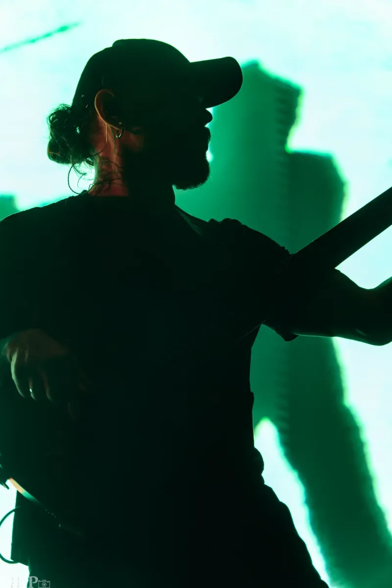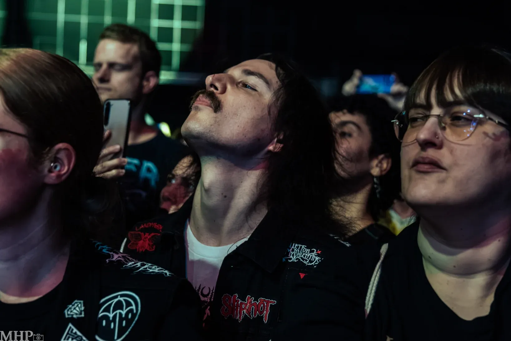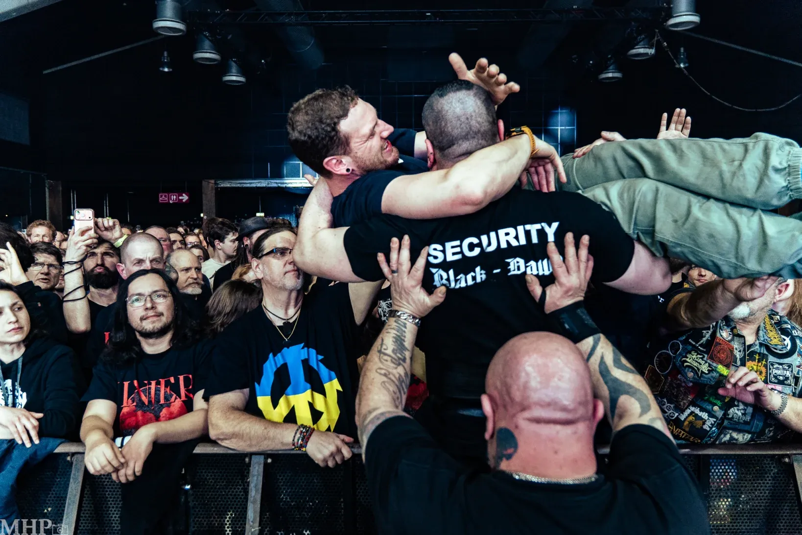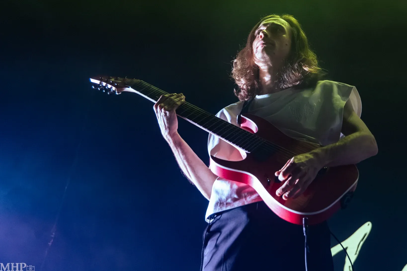 Zuerst betreten die Niederländer von Textures die Bühne im Schlachthof Wiesbaden – die Halle ist bereits gut gefüllt. Von der Security erfährt man, dass bis auf wenige Tickets die Halle fast ausverkauft ist. Die 2001 gegründete Band hatte sich 2017 zwar aufgelöst, aber seit 2023 ist das Sextett wieder aktiv. Ihren Stil beschreibt die Band selbst als „Polyrhythmic Metal Madness“, ich denke man kann es am besten mit Progressive Death Metal beschreiben. Dementsprechend lang und komplex sind die Songs von Textures, definitiv nicht jedermanns Sache, aber technisch auf jeden Fall sehr anspruchsvoll und mit knapp 40 Minuten spielen Textures auch ein ordentliches Set für einen Opener und kommen beim Publikum sehr gut an.