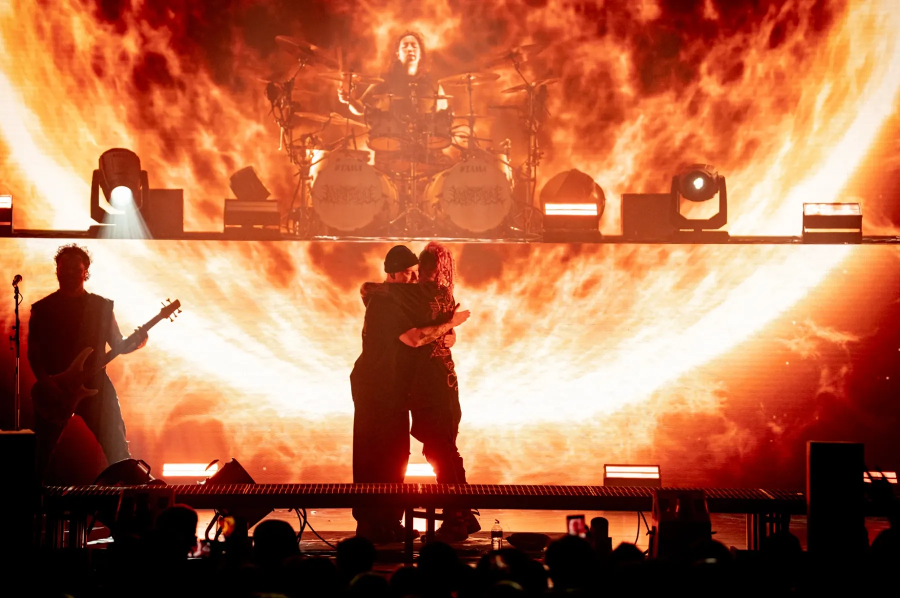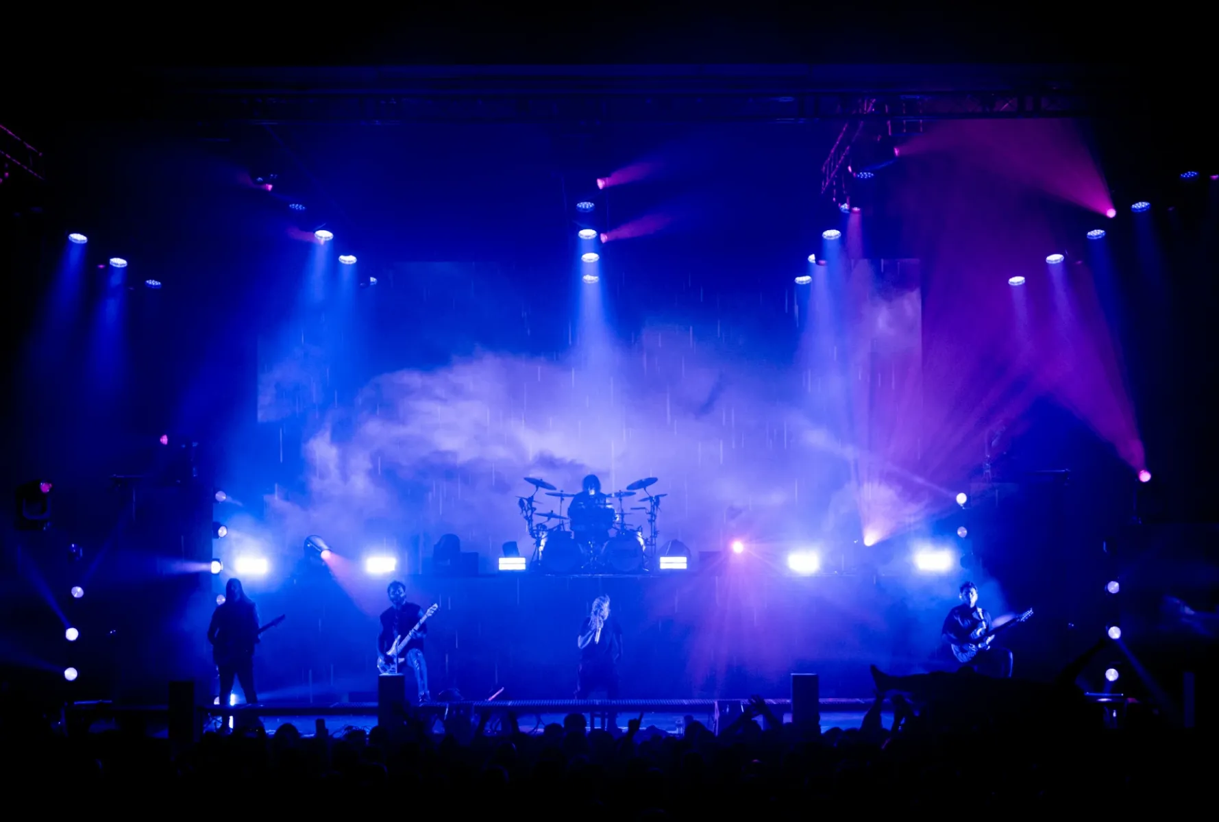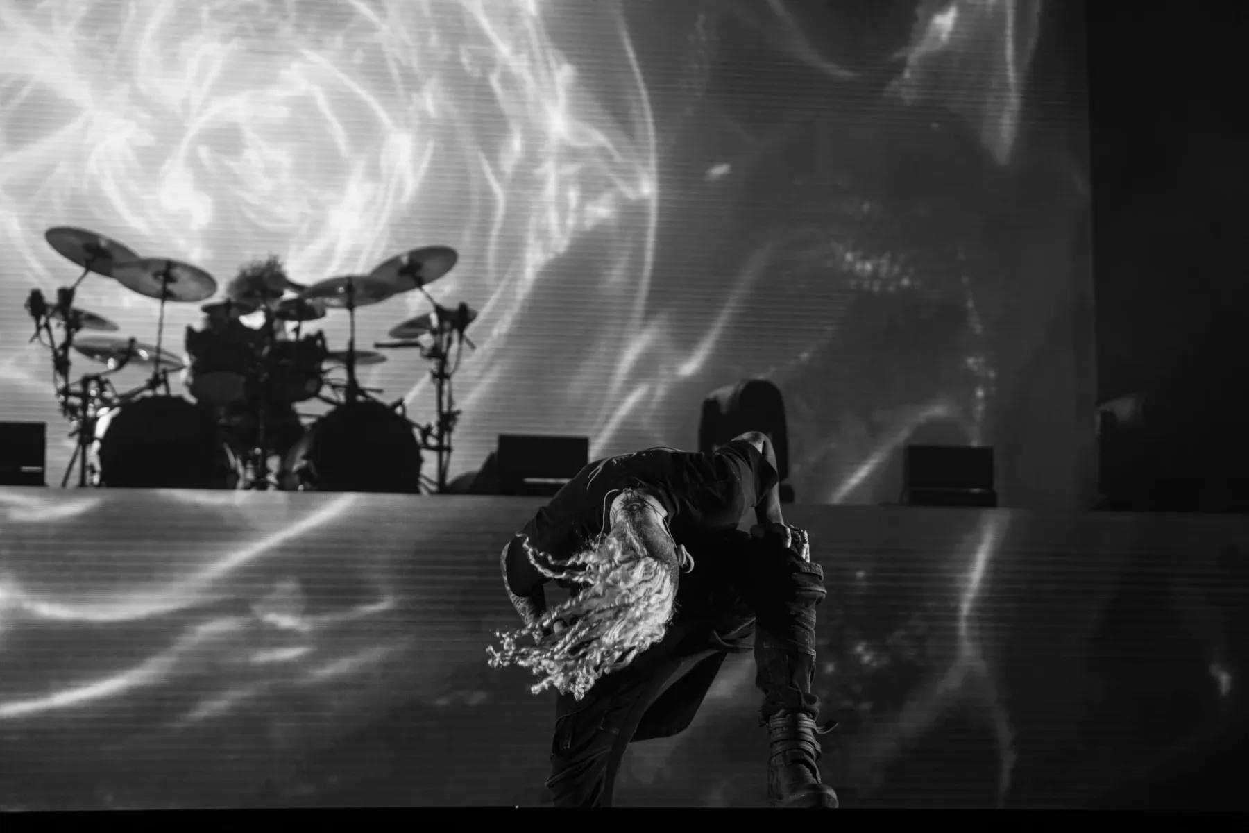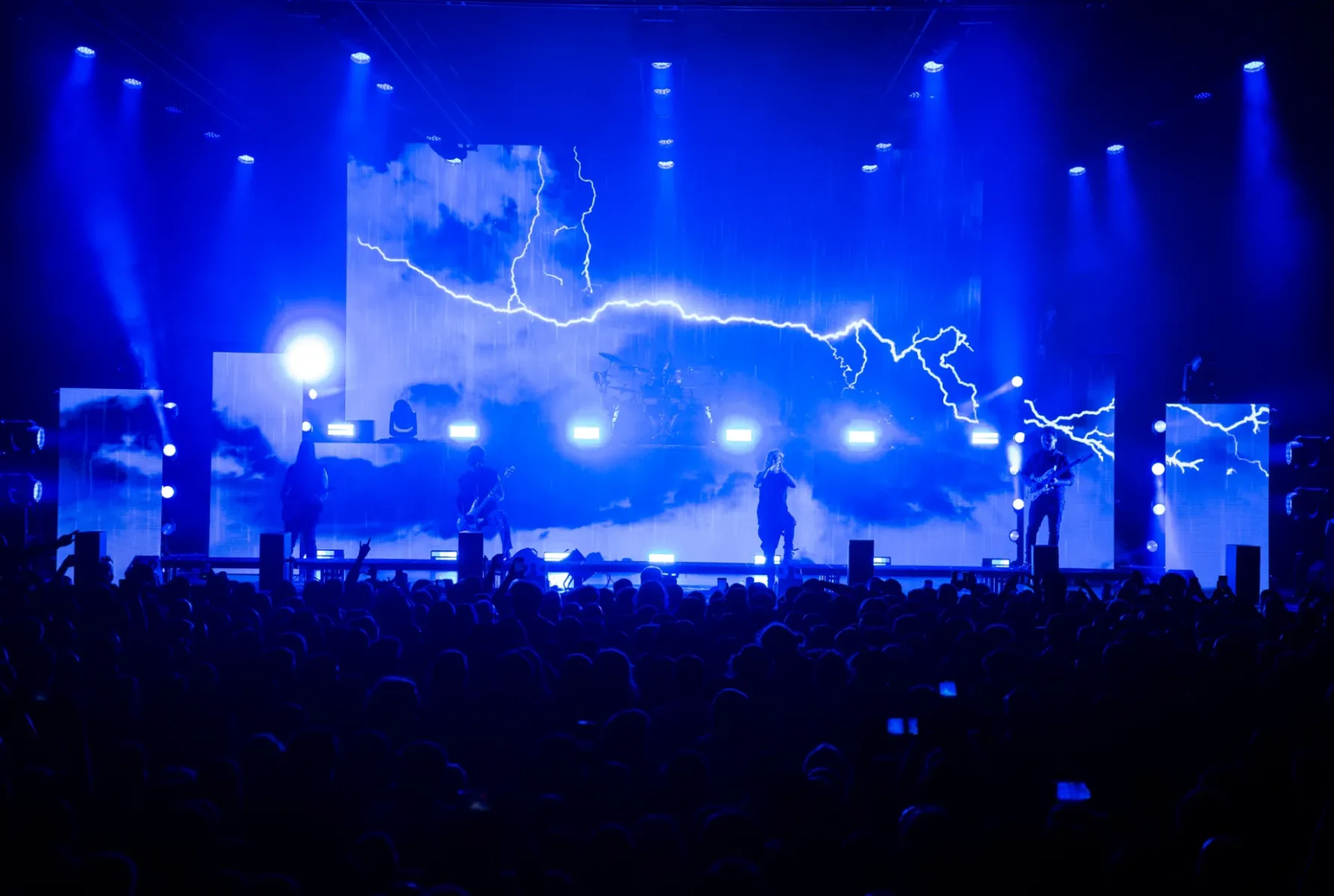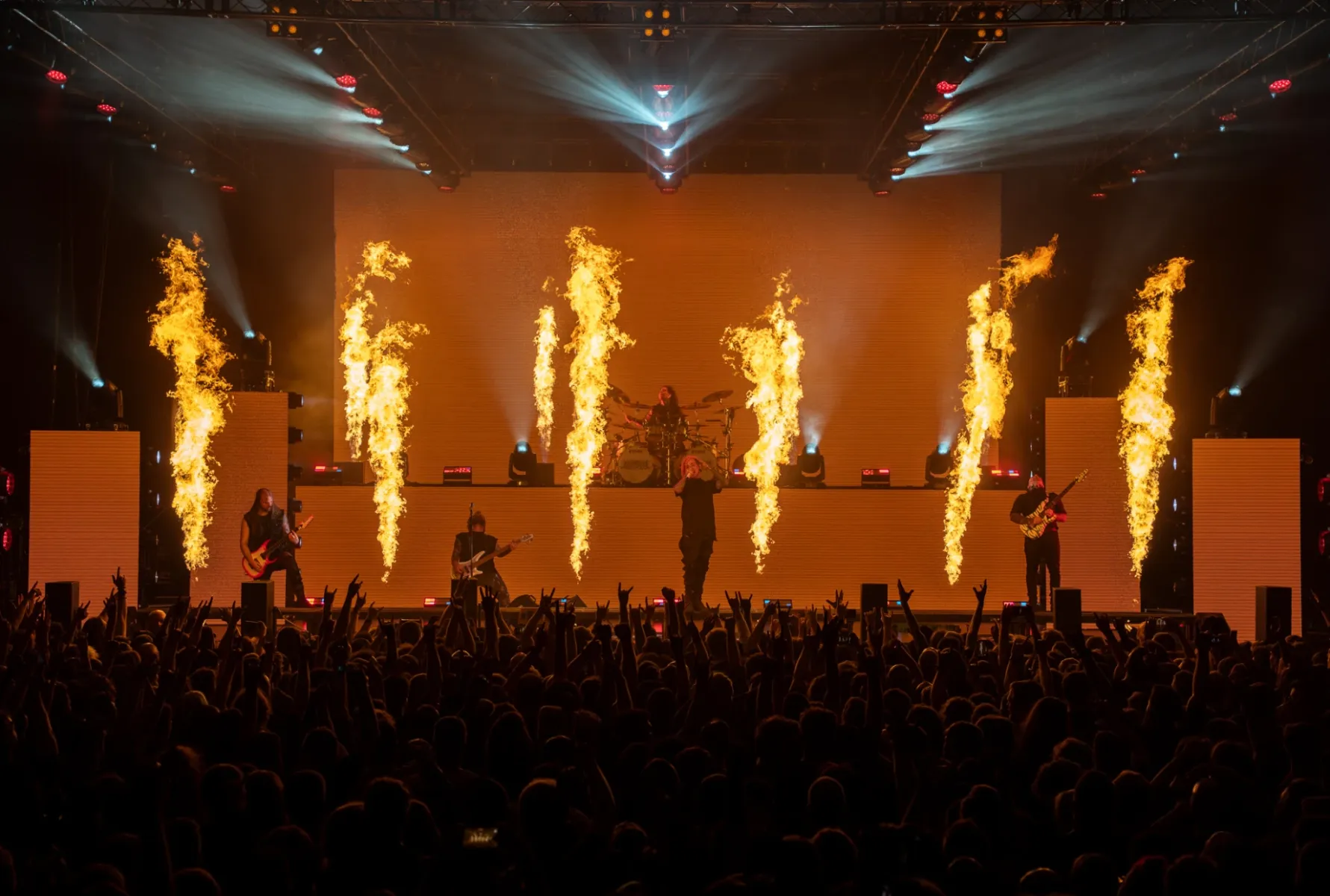 Auch visuell fuhr die Band groß auf. Riesige Videowalls dominierten die Bühne und wechselten zwischen düsteren Regenmotiven und brennenden, abstrakten Szenarien. Die Bilder unterstützten den epischen Charakter der Songs, ohne vom Geschehen auf der Bühne abzulenken. Pyro wurde im weiteren Verlauf des Sets immer wieder gezielt eingesetzt – nicht übertrieben, aber wirkungsvoll genug, um Highlights zu setzen. Auch Lorna Shores‘ Fotograf durfte mit auf die Bühne und zum Mikro greifen.