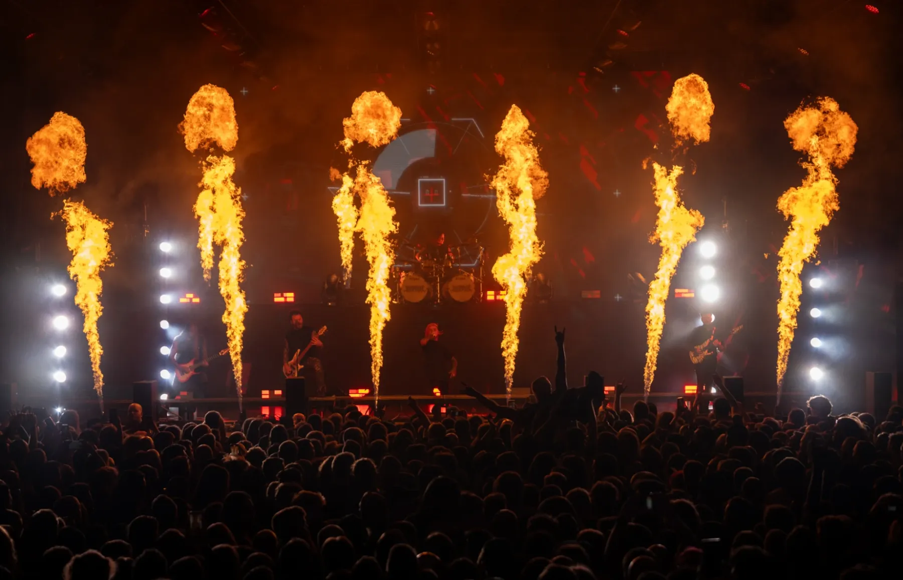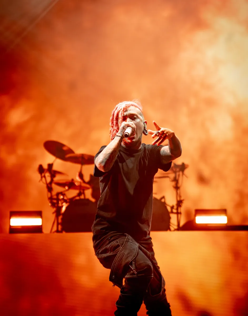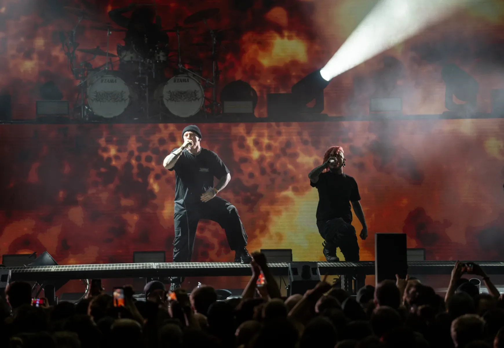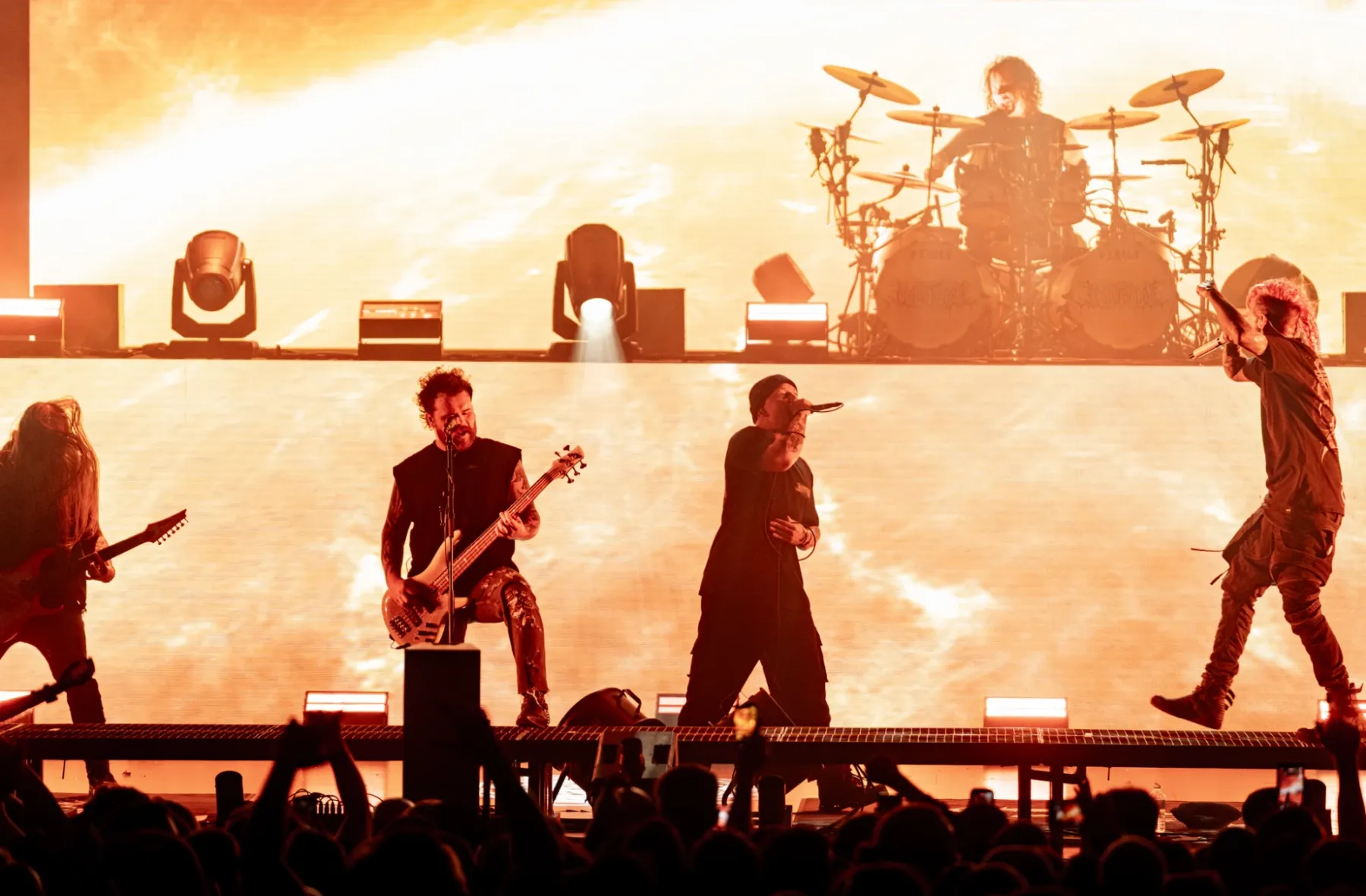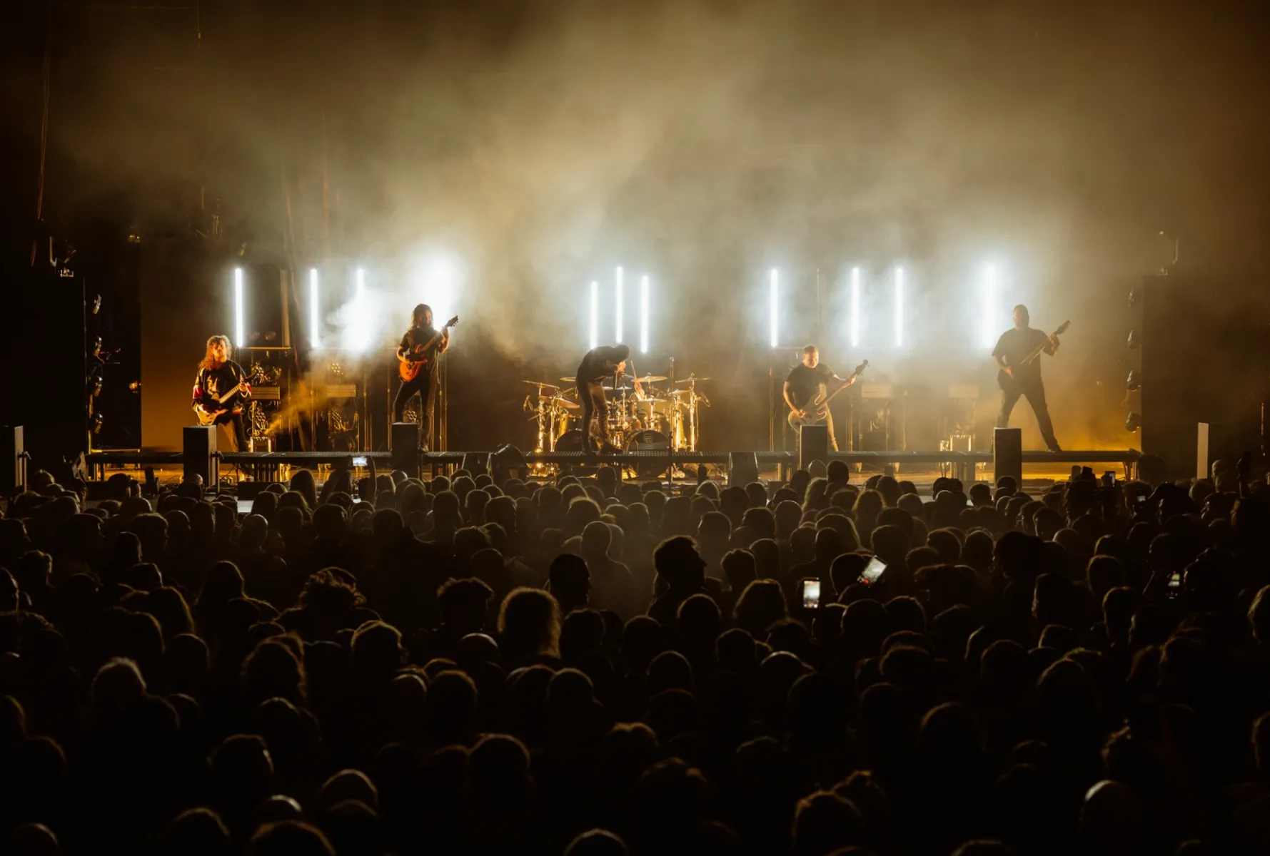 Auch visuell fuhr die Band groß auf. Riesige Videowalls dominierten die Bühne und wechselten zwischen düsteren Regenmotiven und brennenden, abstrakten Szenarien. Die Bilder unterstützten den epischen Charakter der Songs, ohne vom Geschehen auf der Bühne abzulenken. Pyro wurde im weiteren Verlauf des Sets immer wieder gezielt eingesetzt – nicht übertrieben, aber wirkungsvoll genug, um Highlights zu setzen. Auch Lorna Shores‘ Fotograf durfte mit auf die Bühne und zum Mikro greifen.