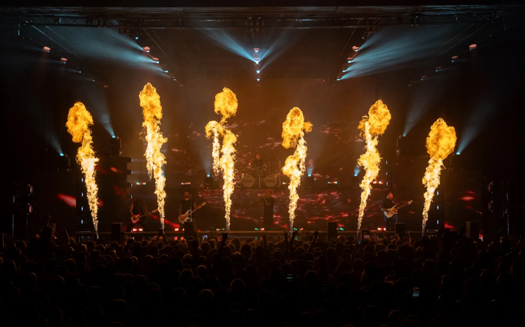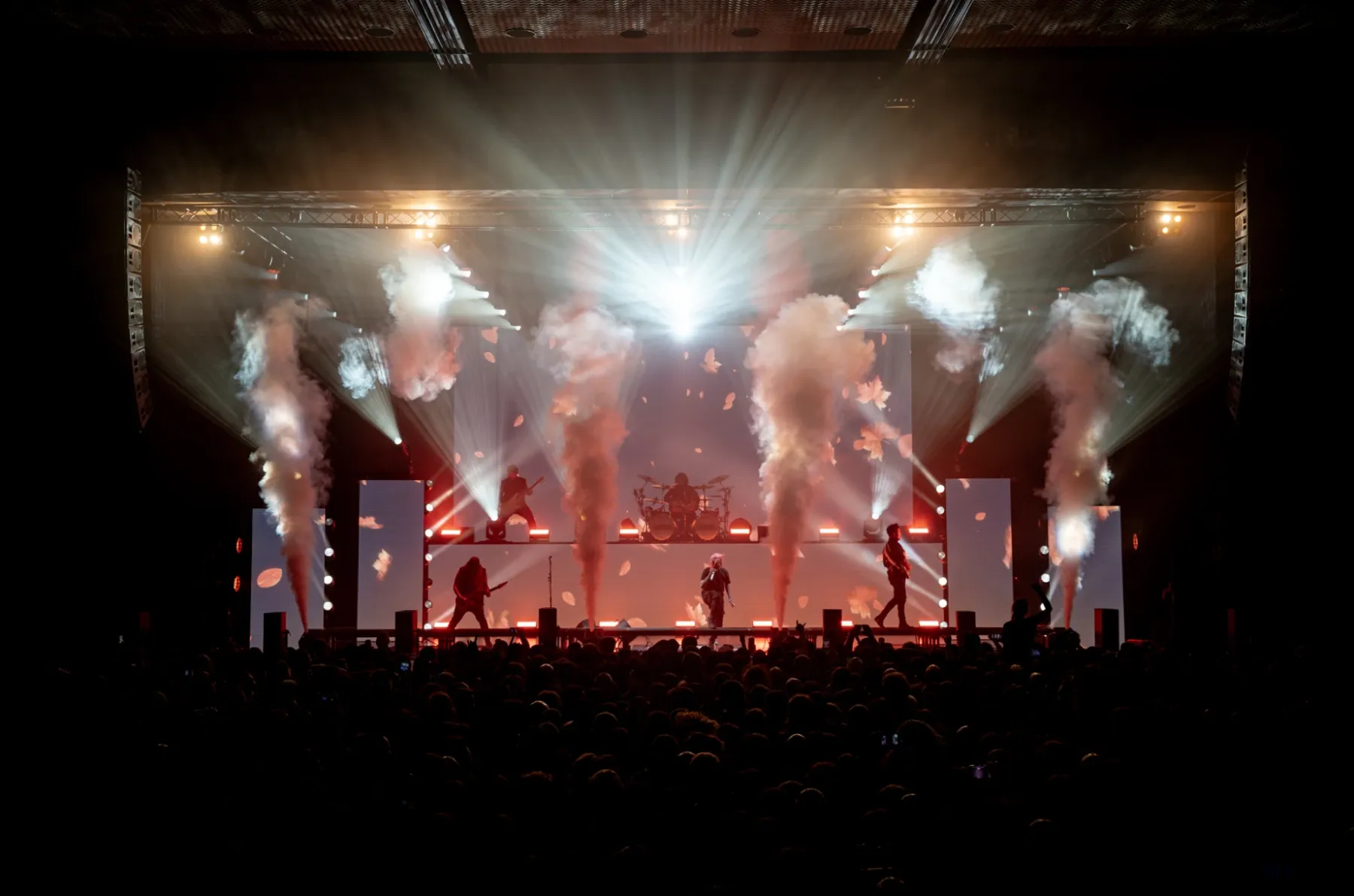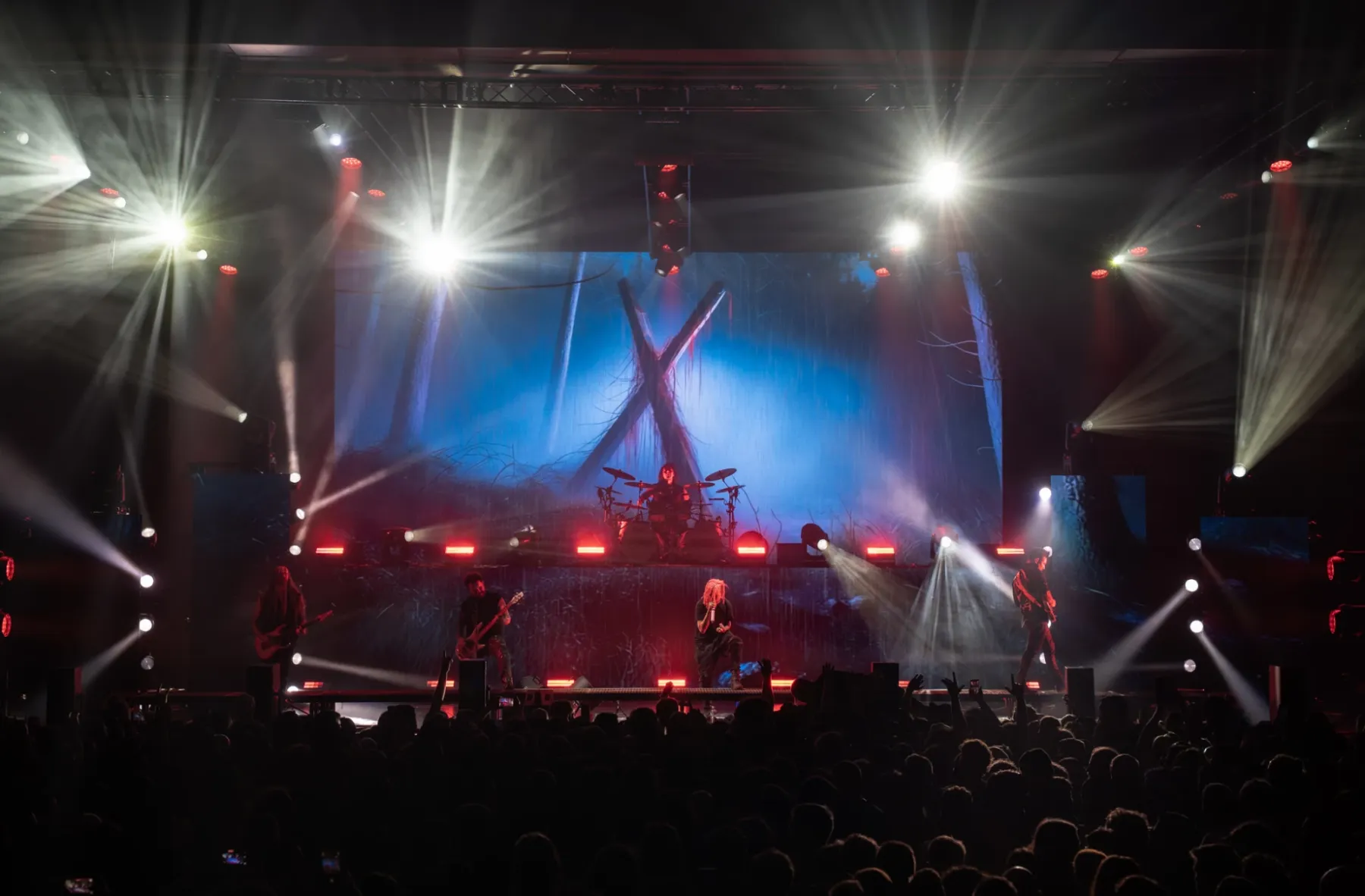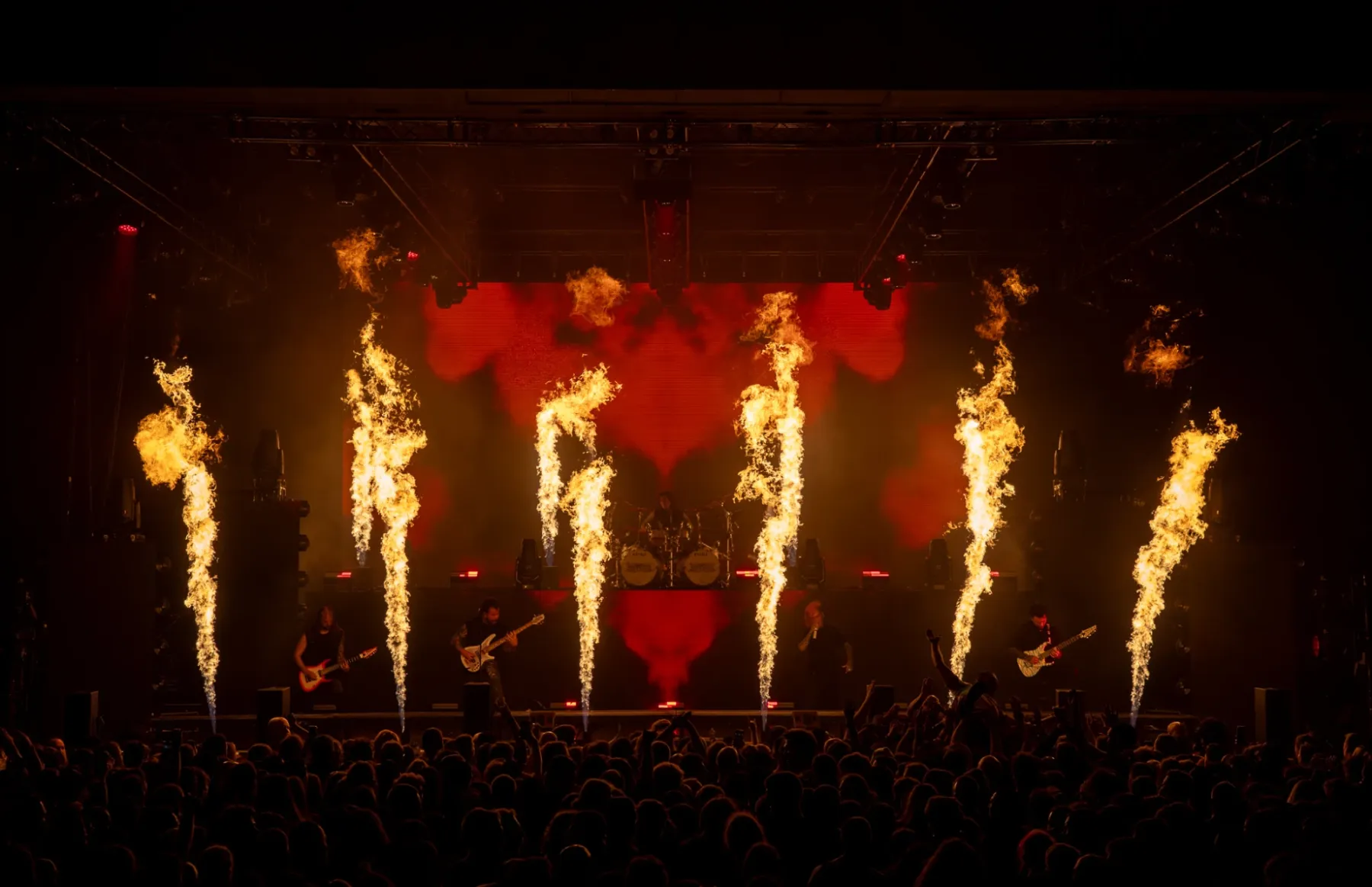 Lorna Shore machten von der ersten Sekunde an deutlich, dass dieser Abend keine Aufwärmphase braucht. Schon der Opener „Oblivion“ wurde von massiver Pyrotechnik begleitet, Flammen schossen direkt zu Beginn in die Höhe und setzten den Ton für das, was folgen sollte. Das Publikum war sofort da: Moshpits öffneten sich unmittelbar und Headbangen was das Zeug hielt, war hier angesagt.