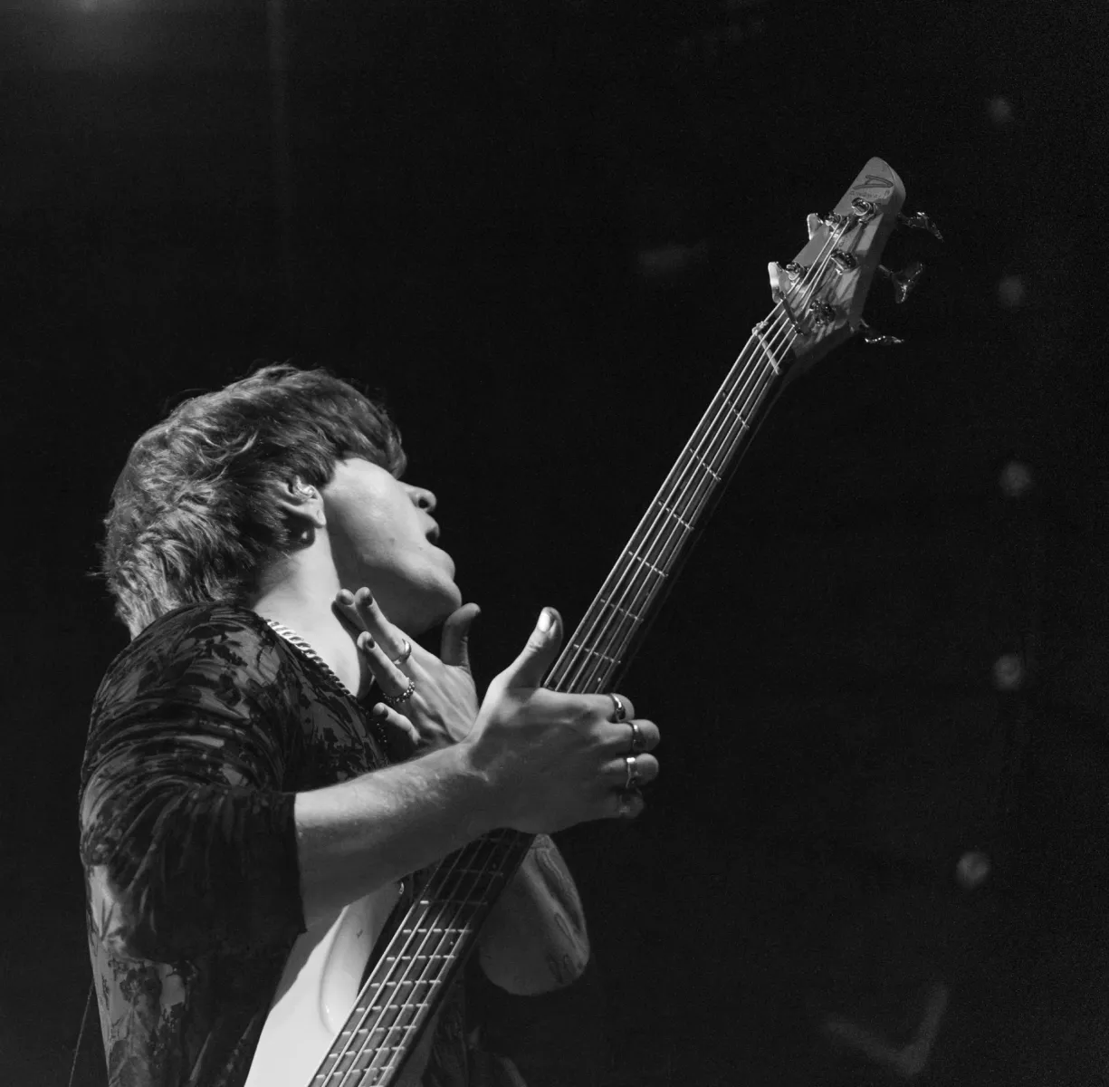 Schließlich durfte in München eine Eigenkreation eines Instruments nicht fehlen. Der Mix aus Gitarre und Bass forderte Dan und Mark heraus, darauf gleichzeitig zu spielen. Damit es nicht langweilig wird, hat sich auch Jonny noch einmal mit Drumsticks ins Geschehen gemischt.