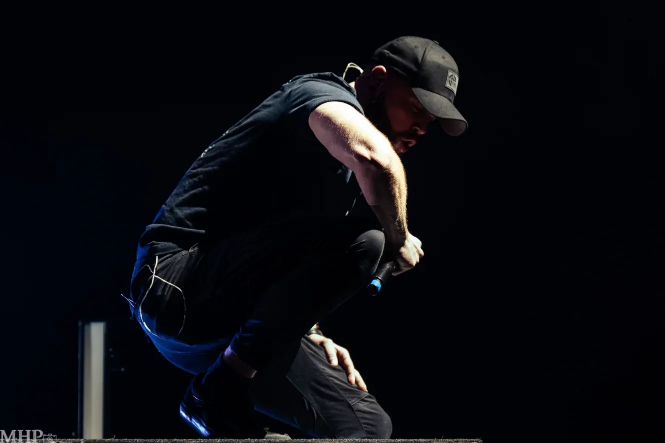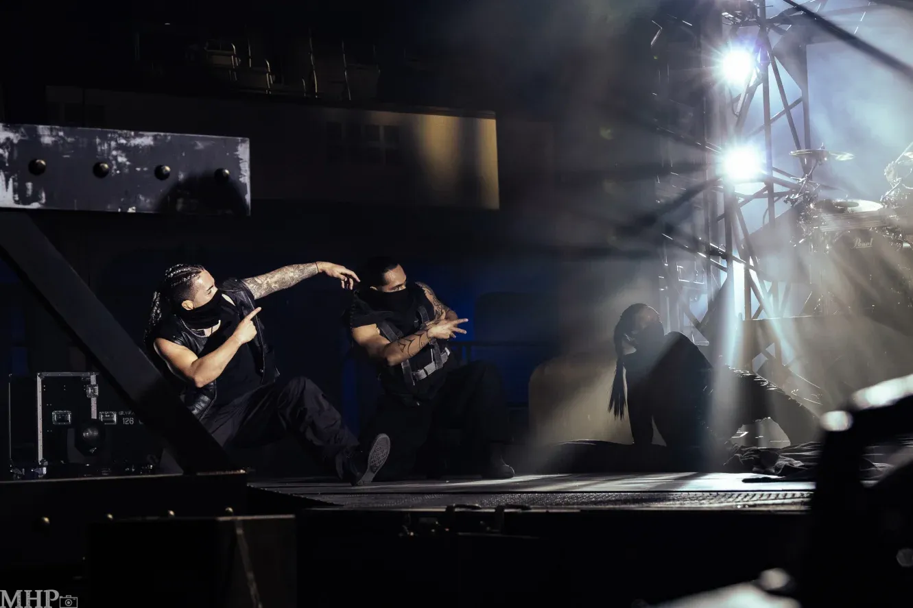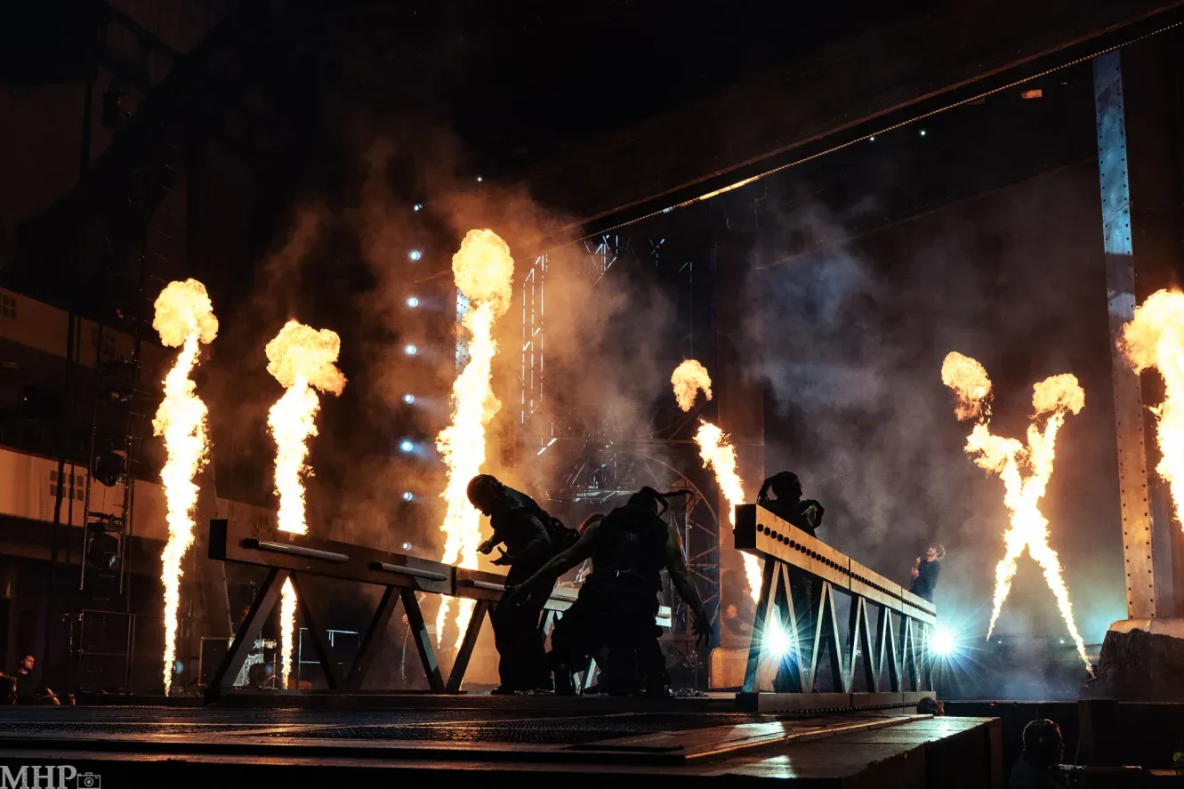 Als zweiten Song wird mit „Prey“ einer der bekanntesten Songs schon gespielt und der Refrain wird aus den über 10.000 anwesenden Kehlen lautstark mitgesungen, Parkway Drive weiß wie man die Crowd von Anfang an begeistert und mitnimmt. Anschließend wird, wieder großartig inszeniert, der „Laufsteg“ heruntergelassen, der die kleine B-Stage mit der großen Hauptbühne verbindet und die Hauptbühne, die bis dato noch mit einem Vorhang verdeckt war, wird enthüllt und mit „Glitch“, Tänzer*innen und den ersten Pyrosalven wurden abgefeuert.