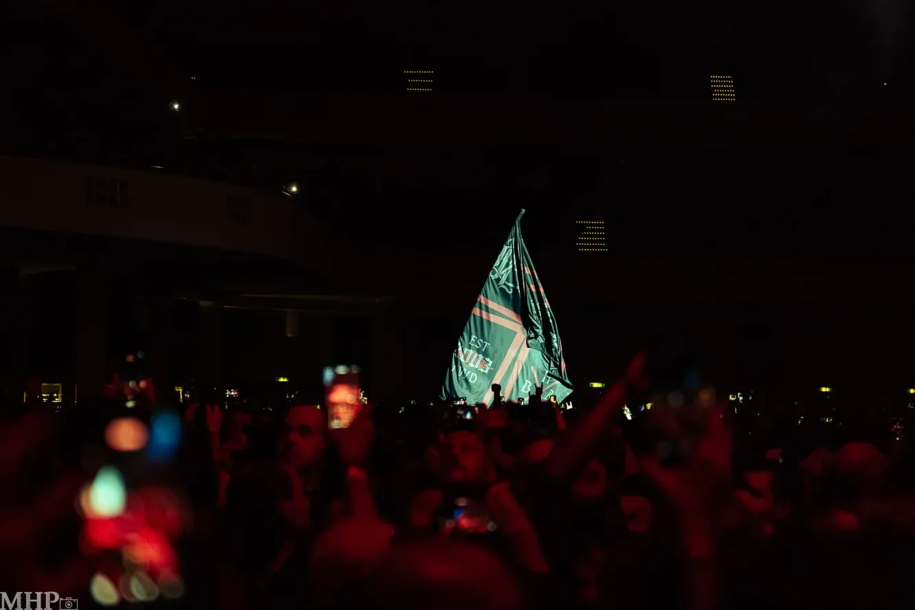 Mit einer kleinen Verspätung kamen dann die Metalcore Giganten von Parkway Drive und diese lieferten schon mit dem Einlauf einen Ausblick auf das, was für die nächsten 2 Stunden zu erwarten war. Mit einem Fahnenträger vorweg (und leicht abgeschirmt durch Security) bahnt sich die Band den Weg durch die Menge und klettert über die Absperrung in den Bühnengraben. Auf der sogenannten B-Stage, die noch getrennt von der Hauptbühne war, eröffnen die Australier ihr Set mit „Carrion“ und die nun gefüllte Halle bejubelt diesen Start.