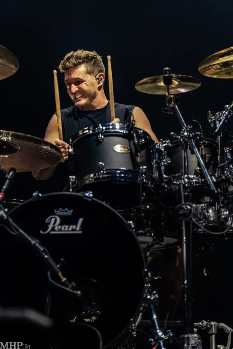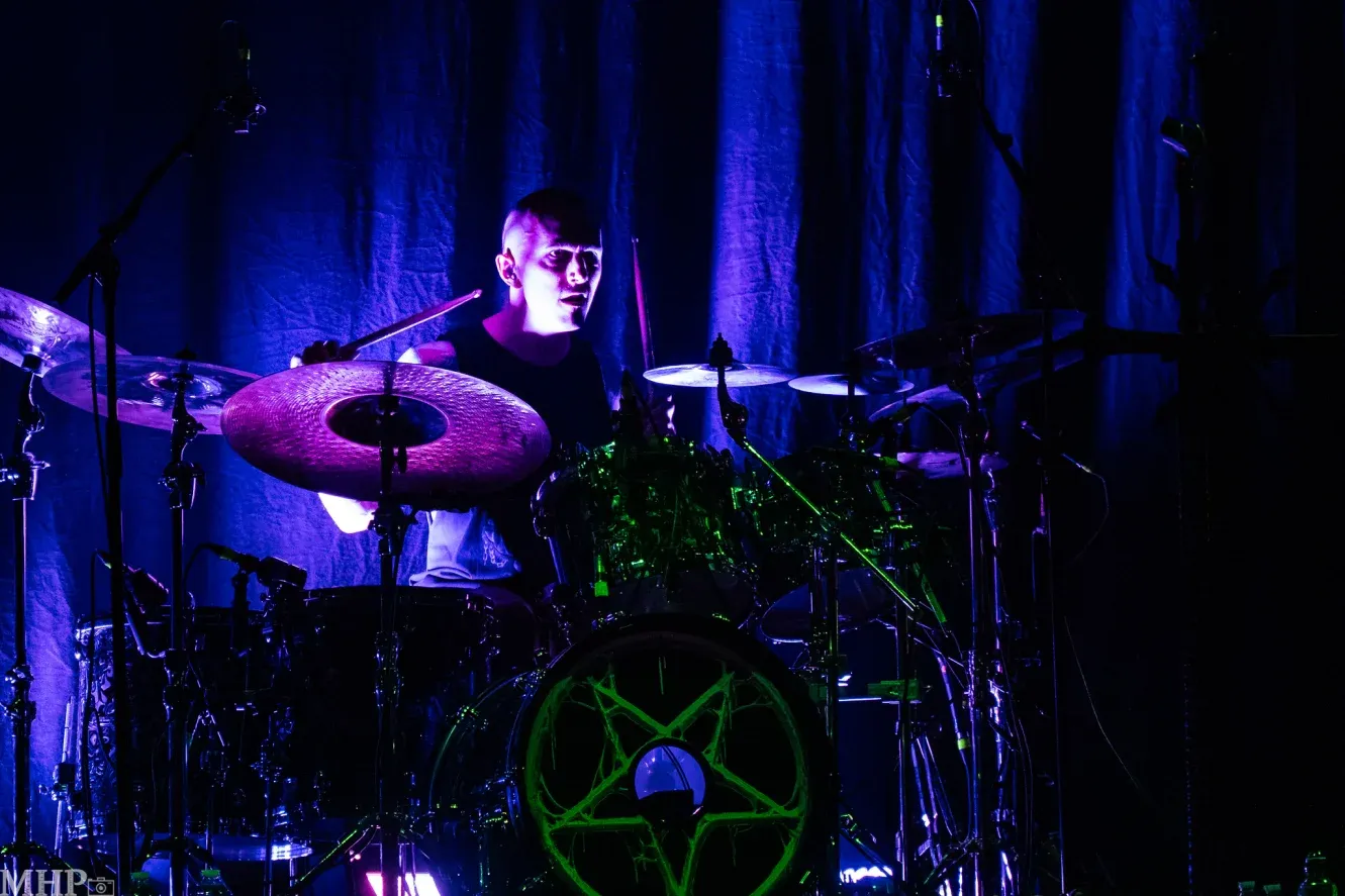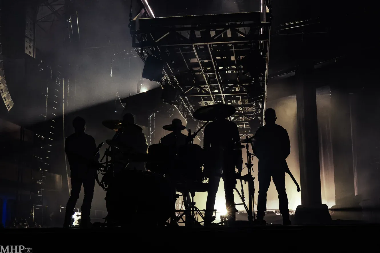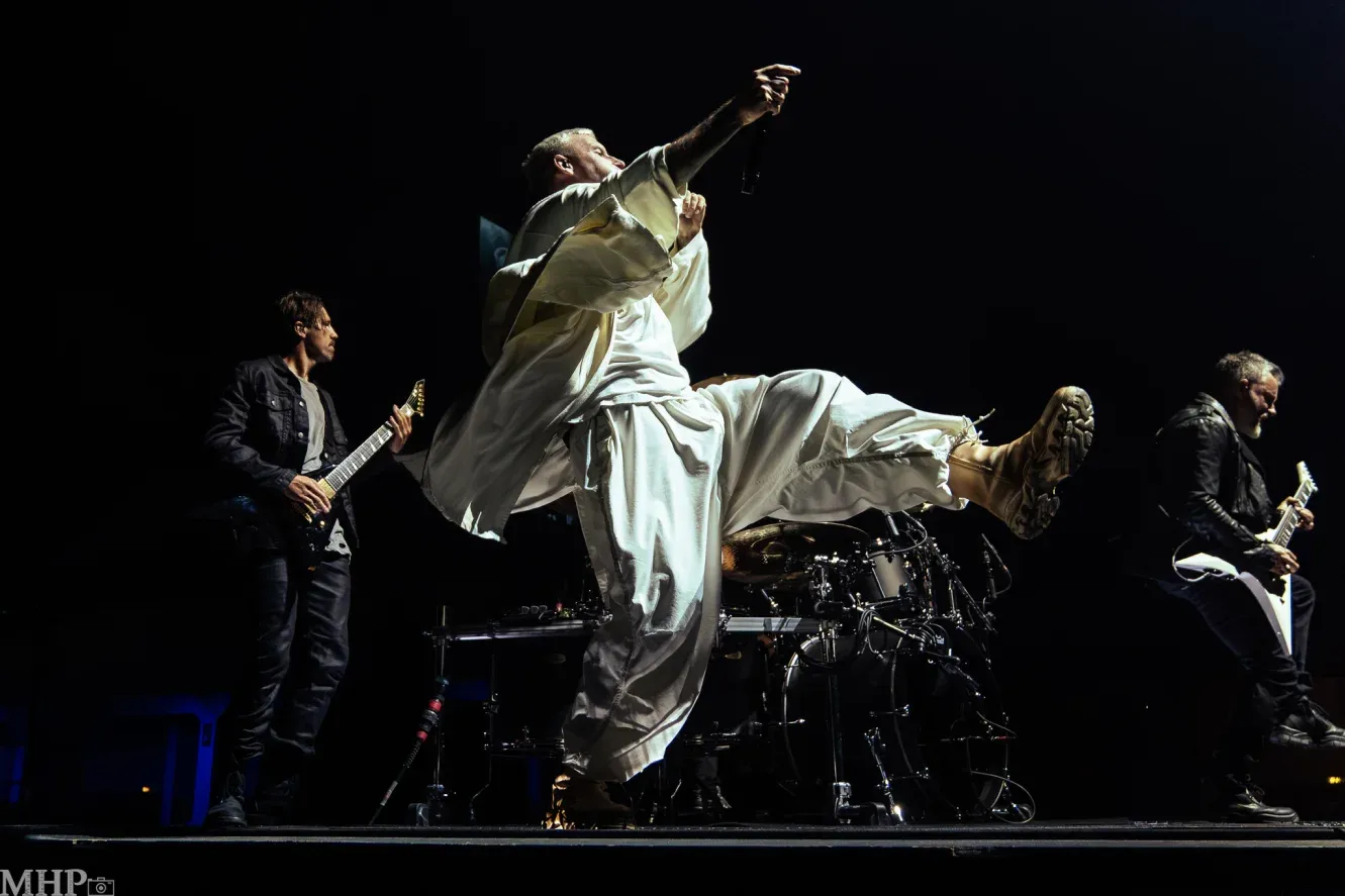 Tatsächlich war das Bühnenbild nicht überladen, die Bühne bot der Band, den Tänzer*innen und den später im Set auftauchenden Streicherinnen viel Platz, aber überall waren kleine Pyroelemente versteckt und das Schlagzeug war wie zu erwarten in seiner Umhausung, aber leider auf der linken Seite der Bühne nicht von jedem Standort aus gut zu sehen. Für „Boneyards“ kriegt die Band Unterstützung von Joel Birch, dem Shouter von The Amity Affliction.