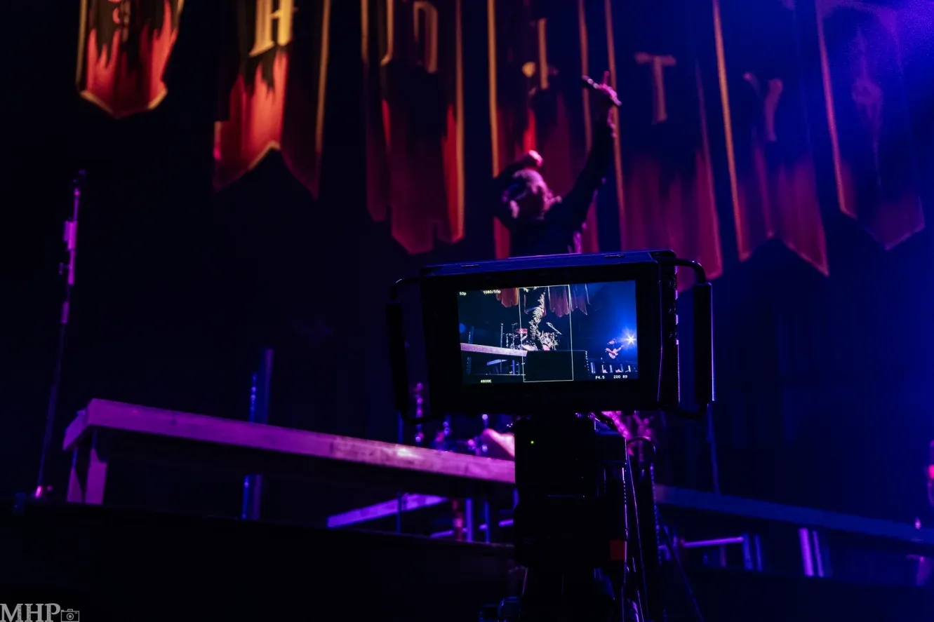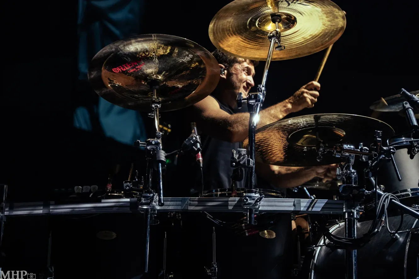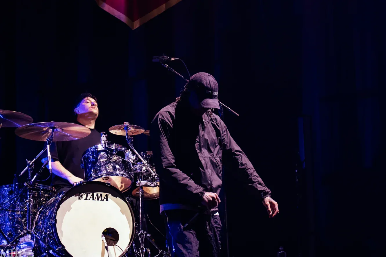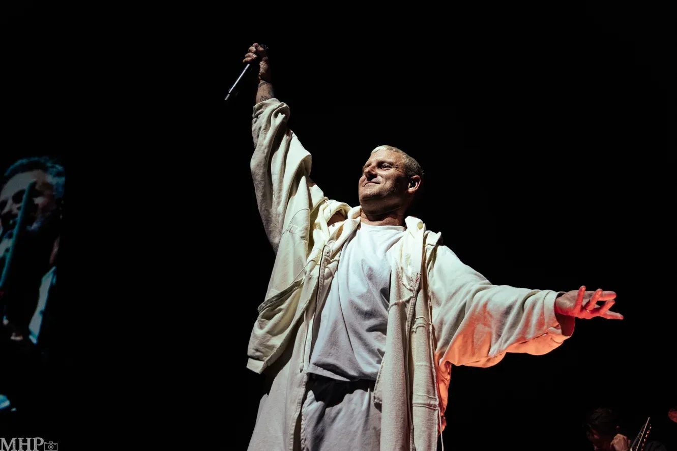 Tatsächlich war das Bühnenbild nicht überladen, die Bühne bot der Band, den Tänzer*innen und den später im Set auftauchenden Streicherinnen viel Platz, aber überall waren kleine Pyroelemente versteckt und das Schlagzeug war wie zu erwarten in seiner Umhausung, aber leider auf der linken Seite der Bühne nicht von jedem Standort aus gut zu sehen. Für „Boneyards“ kriegt die Band Unterstützung von Joel Birch, dem Shouter von The Amity Affliction.