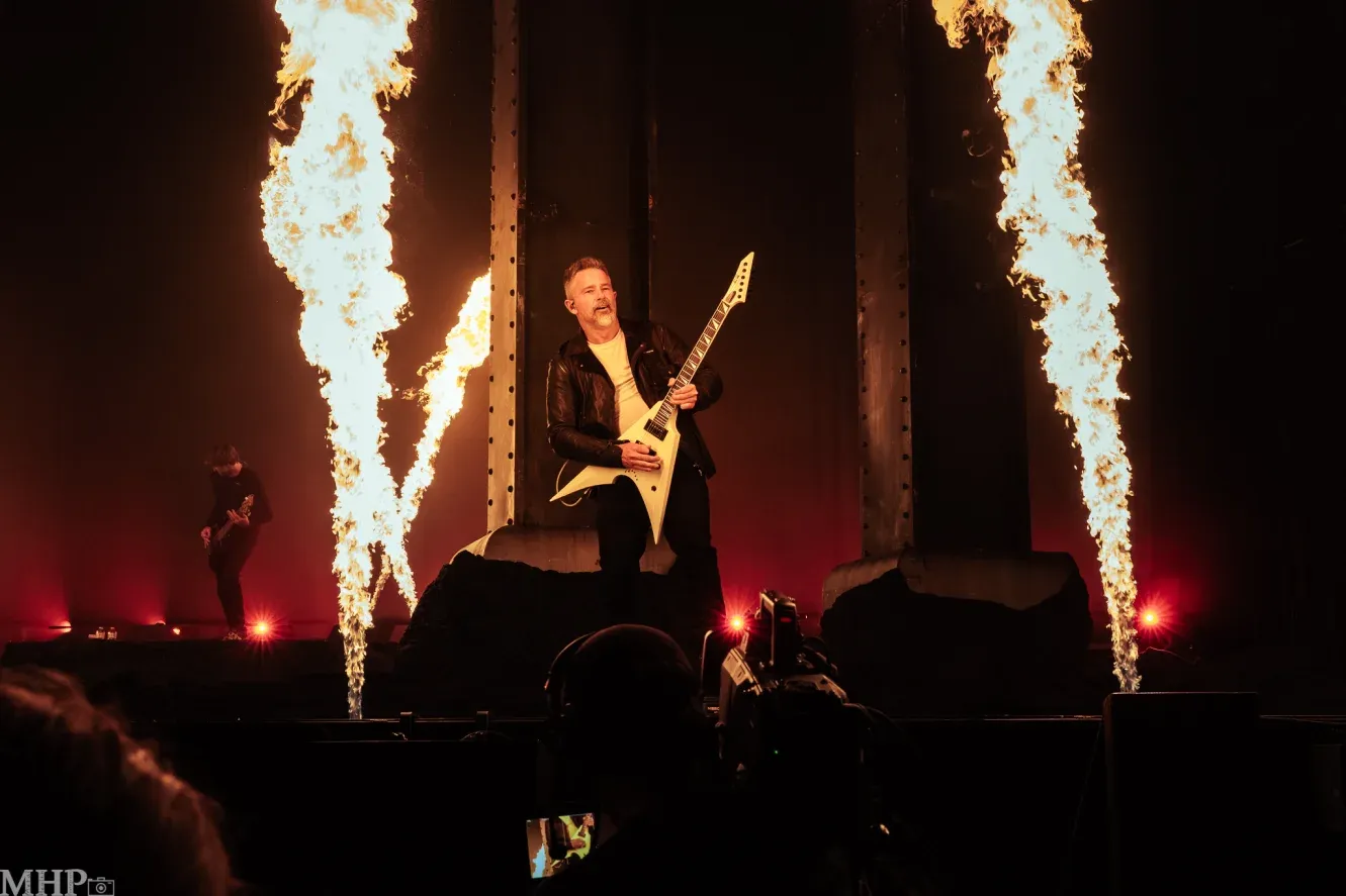 Und so zieht es sich die ganze Show über durch, der „Laufsteg“ wird mal mit Gitarrist Jeff Ling an Board während eines ausgedehnten Gitarrensolos hochgezogen und ein Funkenregen von der Unterseite des Stegs abgefeuert, mal haben sich die drei Streicherinnen (eine Cellistin und zwei Violinistinnen) darufgeschlichen und werden herabgelassen und immer wieder der Einsatz kleinerer oder größerer Pyro- und Nebeleffekte.