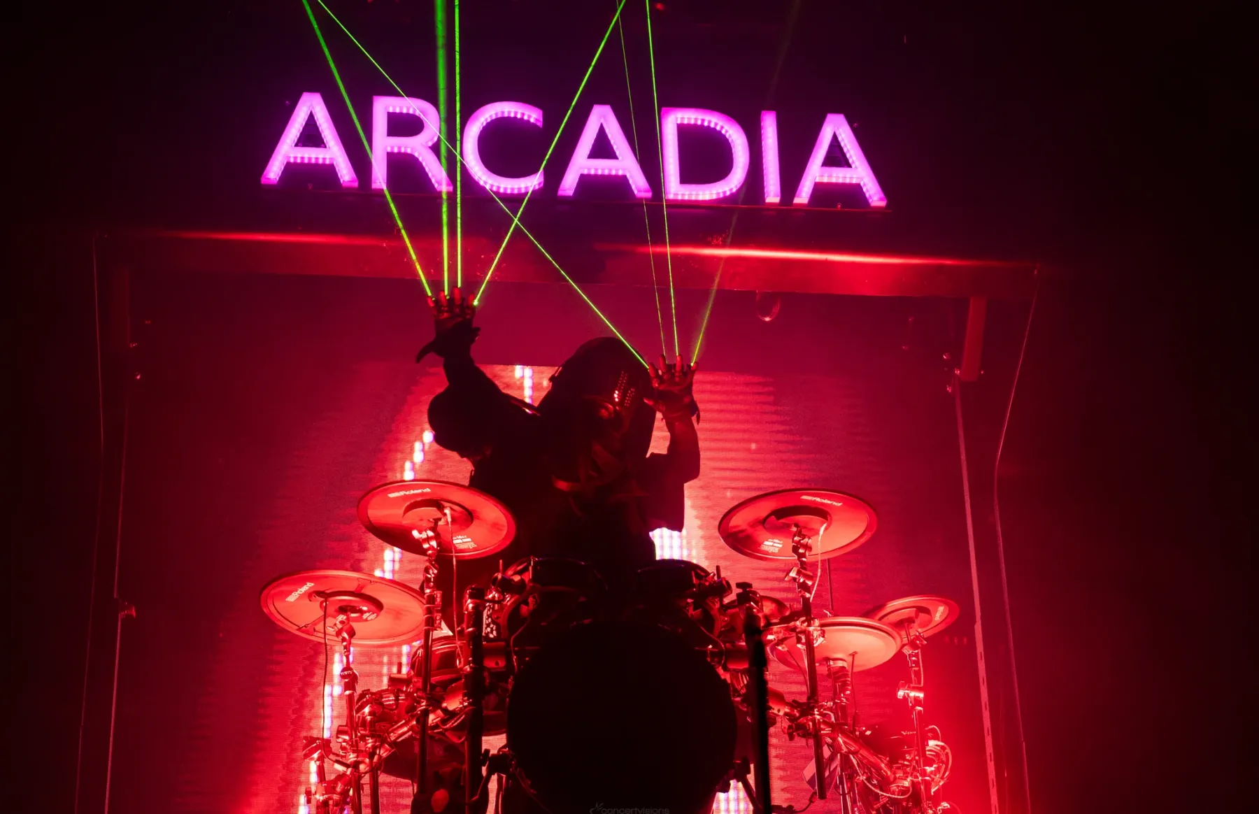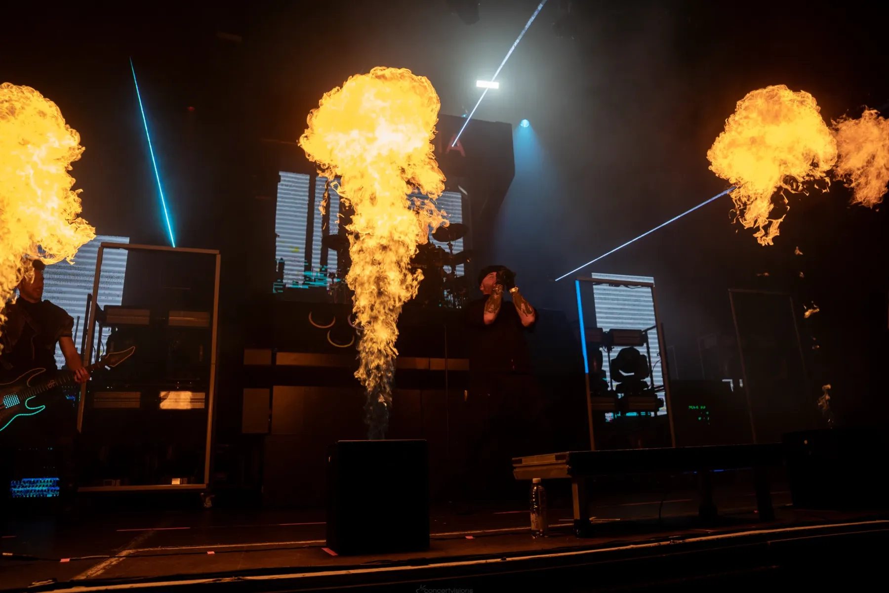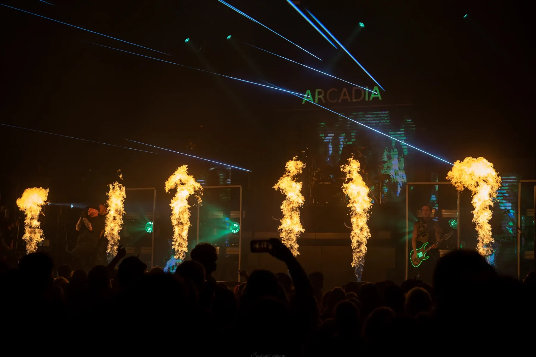 Mit der Pyro war übrigens an diesem Abend noch lange nicht Ende der Fahnenstange, was die Effekt anbetrifft. Nein, immer häufiger sieht man nun bei Rock- und Metalkonzerten, dass auch Laser zum Einsatz kommen. Und sind wir ehrlich, wo könnten sie besser passen, als bei einer Band, die bereits mit The APOC einen Drummer hat, der schon eine leuchtende Maske trägt? Aber seht selbst, wie gut die Kombi optisch passt! 🙂