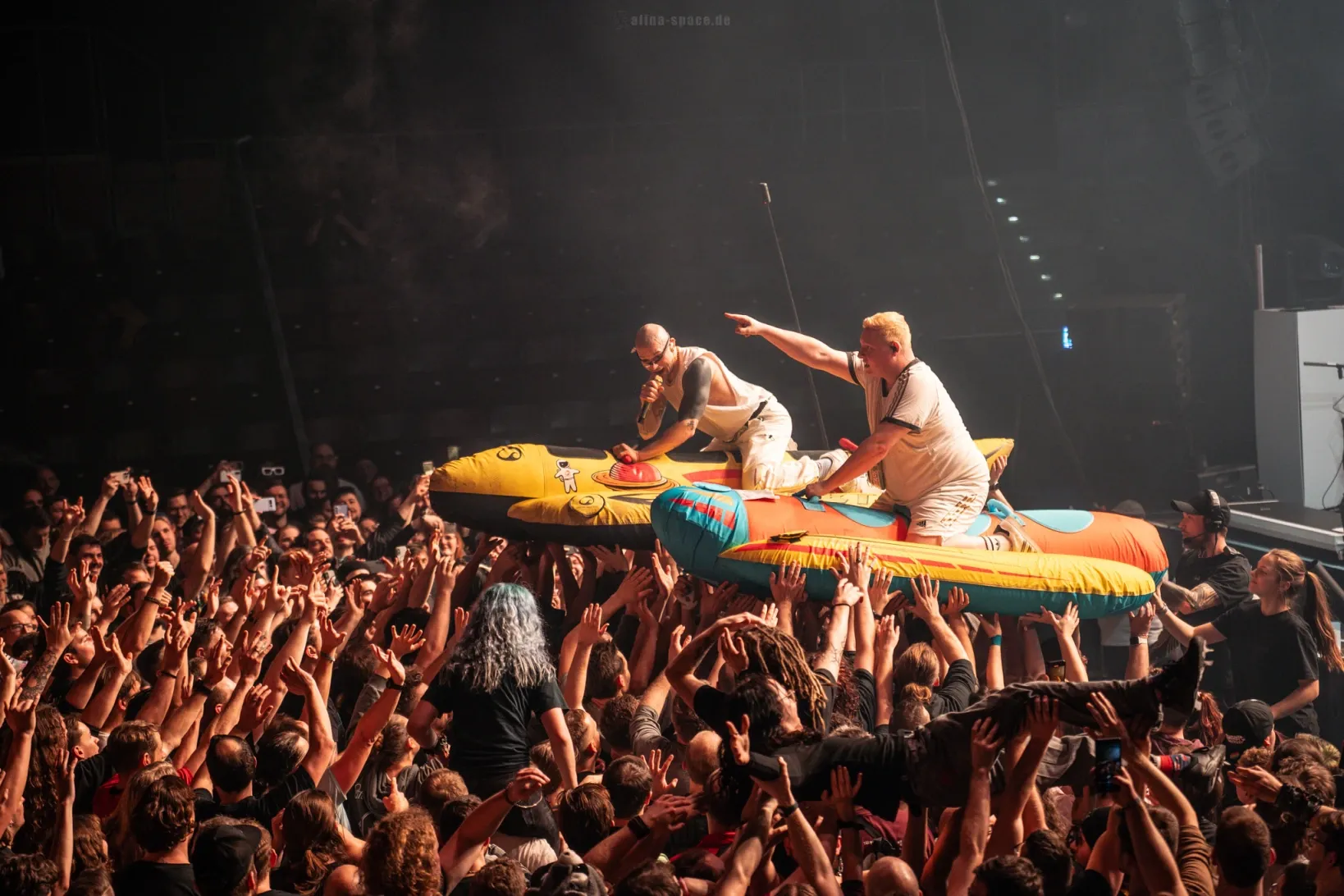 Einer der neusten Songs „Klettergerüst“ wurde mit Cowboyhüten am andern Ende der Halle präsentiert. Doch um dort hinzukommen, gab es ein Wettrennen mit aufblasbaren Booten. Die beiden Sänger Alex und Stroppo warfen zwei Boote auf die Menge und gaben sich im gemeinsamen Crowdsurf-Boot-Rennen die Ehre. Humorvoll erwähnten die beiden, dass das Publikum der Verliererseite danach die Halle verlassen müsse. Gewonnen hat Stroppos Seite, da Alex kurz vor dem Ziel „tauchen“ gegangen ist. Den restlichen Weg hat er dann in der Menge zu Fuß zurückgelegt.