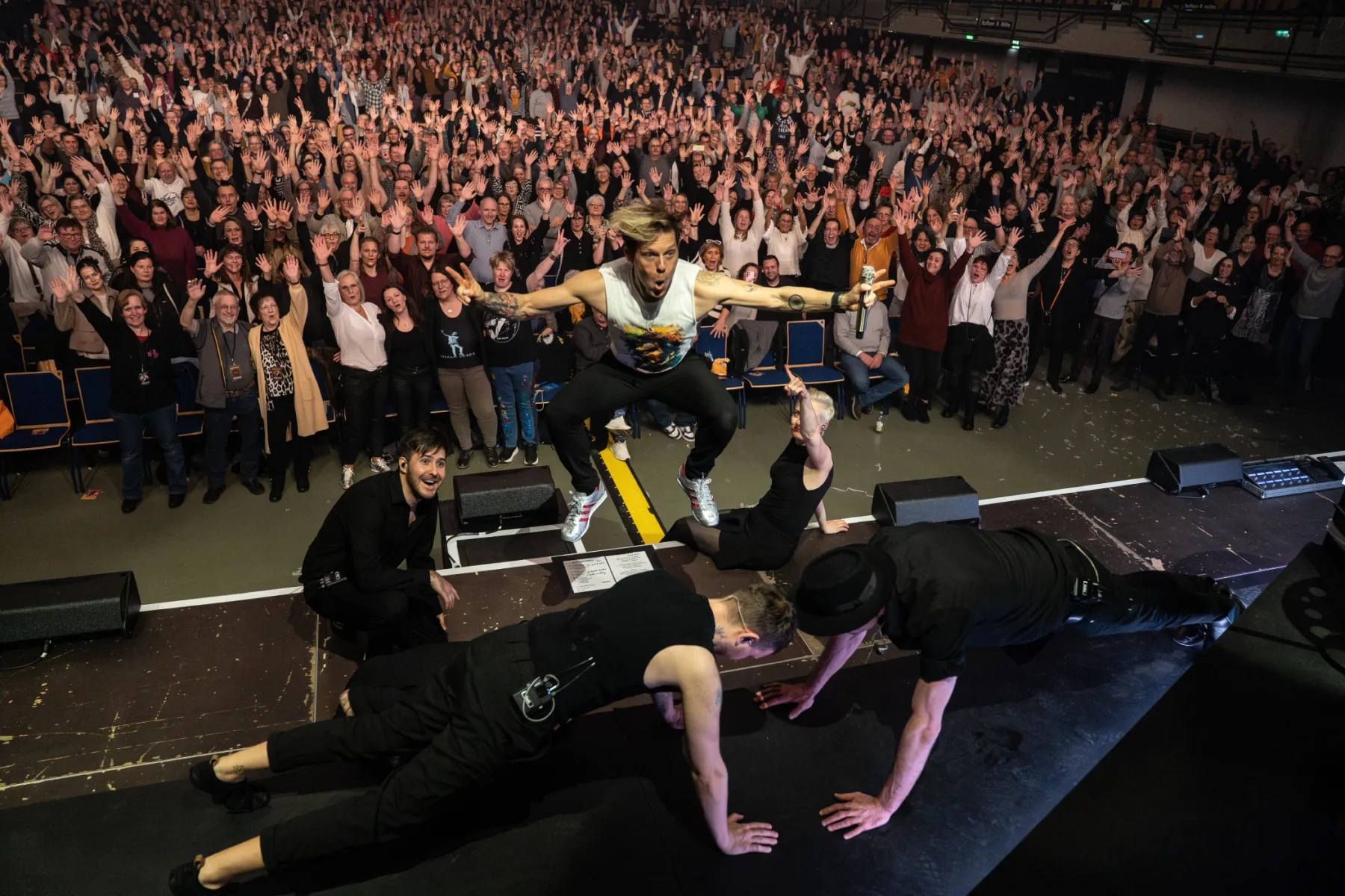 Wer Billy und seine Shows kennt, weiß, dass er sich gerne mit viel Energie auf einer großen Bühne bewegt. Da dies in Ludwigshafen nur eingeschränkt möglich war, sprang er eben mit seiner Gitarre ins Publikum und performte in Mitten seiner Fans.