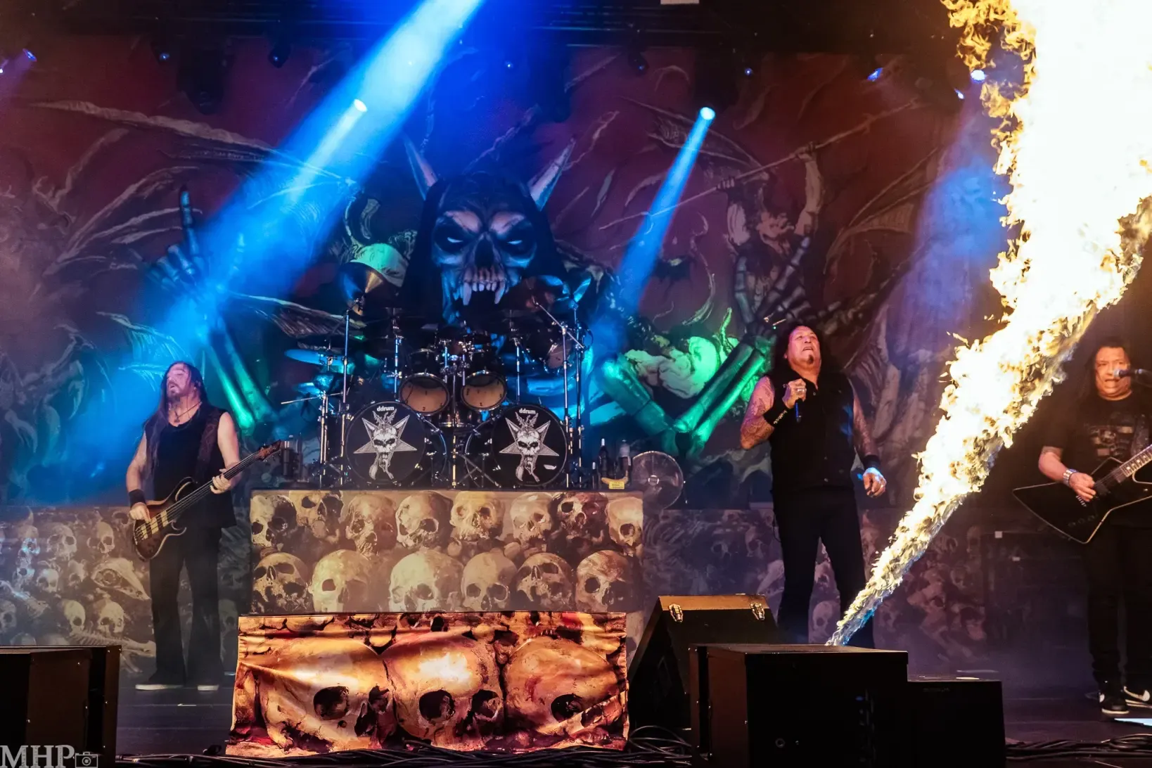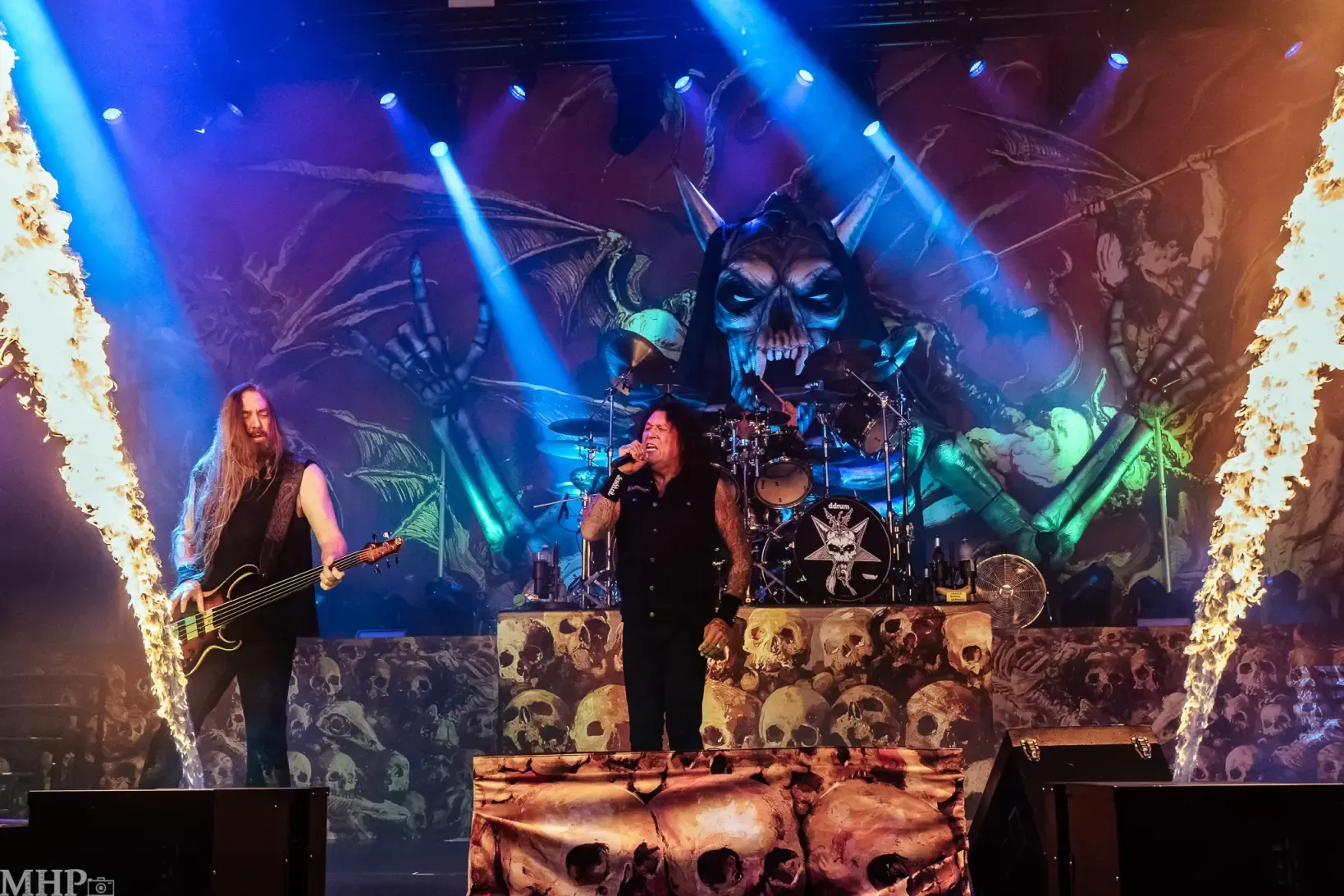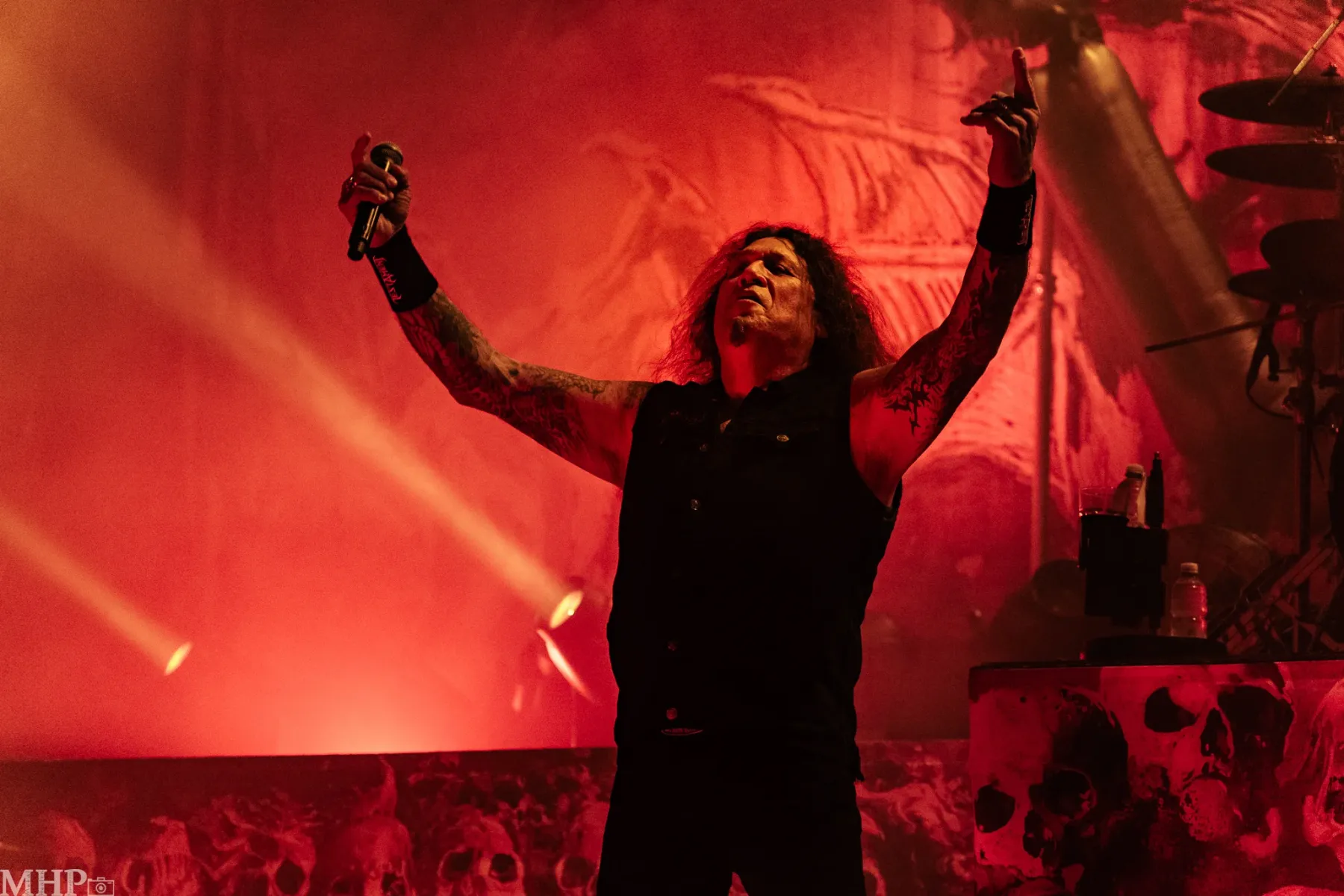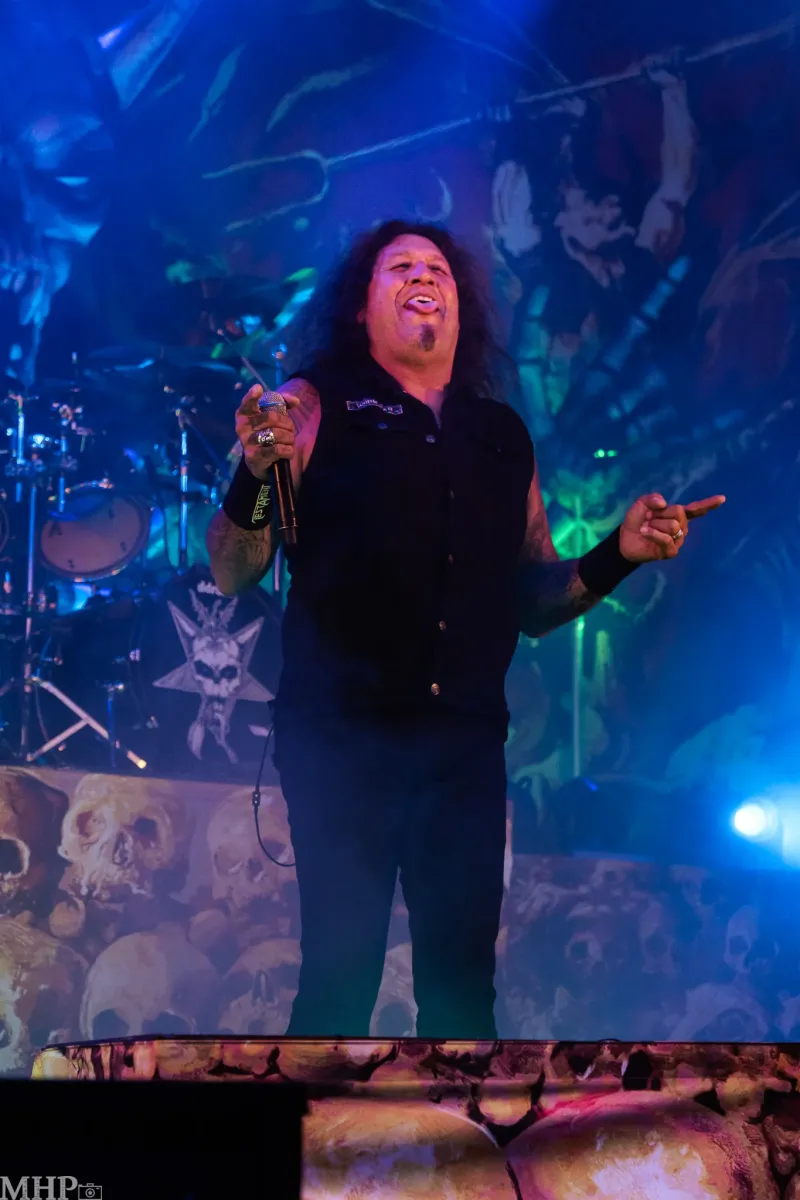 TESTAMENT führt uns schnell in die Anfänge ihrer Karriere mit dem schon fast hymnisch anmutenden ‚Practise what you Preach‘, und dem unerbittliche krachenden ‚Sins of Omission‘ – klassischer Oldschool-Thrash aus 1989. Chuck Billy ist einfach eine Erscheinung, wenn er sich vor dem Publikum aufbaut und mit seiner kräftigen gutturalen Stimme ins Mikrofon brüllt. Bekomme ich das Gänsehaut? Absolut. Die Setlist zeigt uns die Breite des Repertoires der Band – so ziemlich jedes Album von TESTAMENT ist hier vertreten.