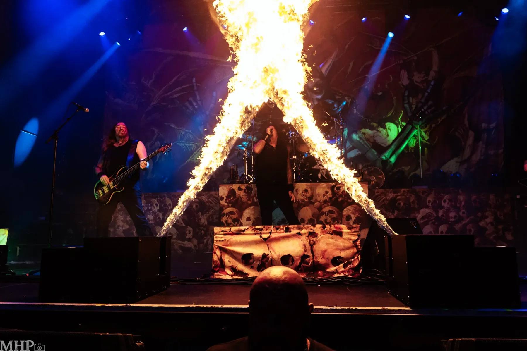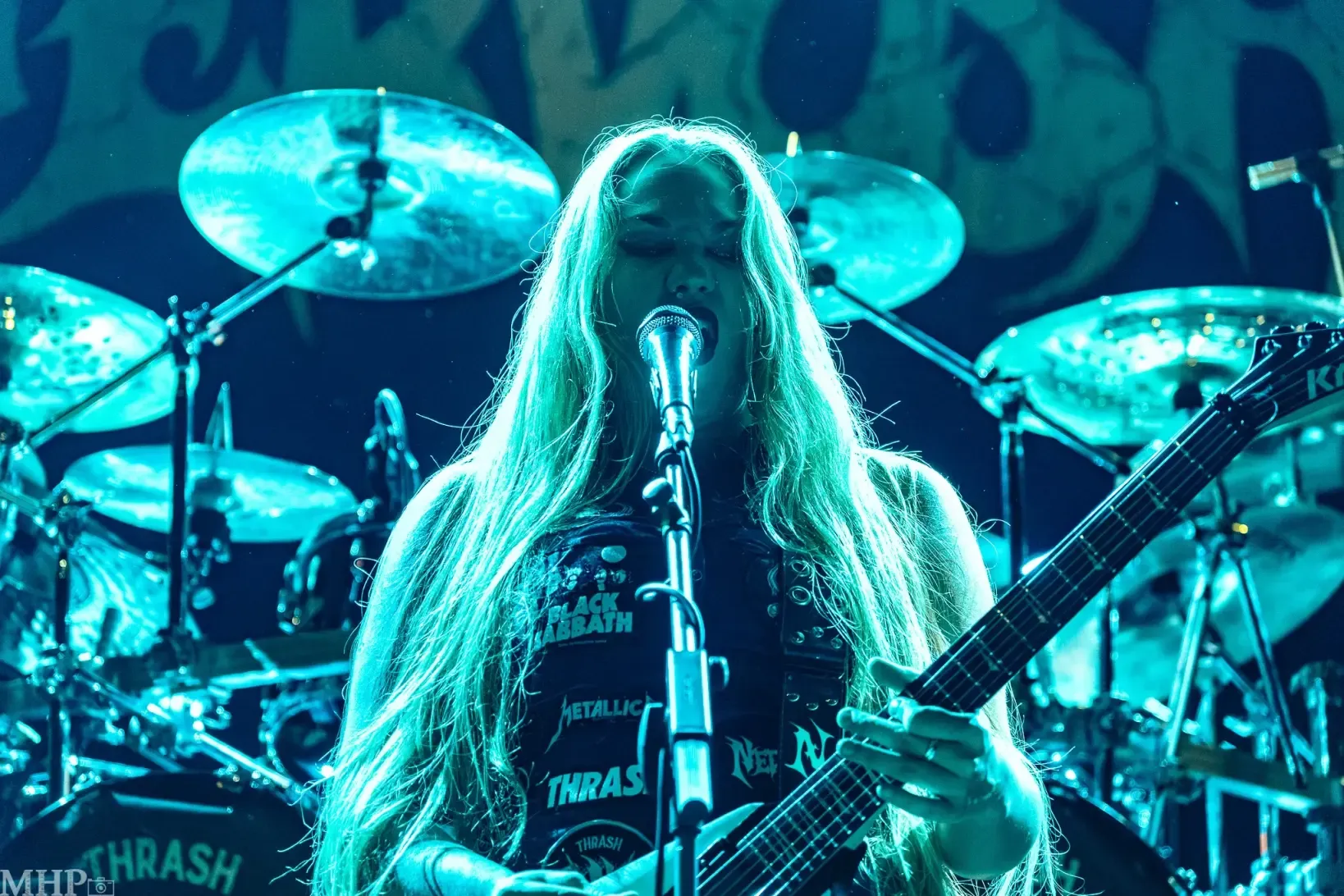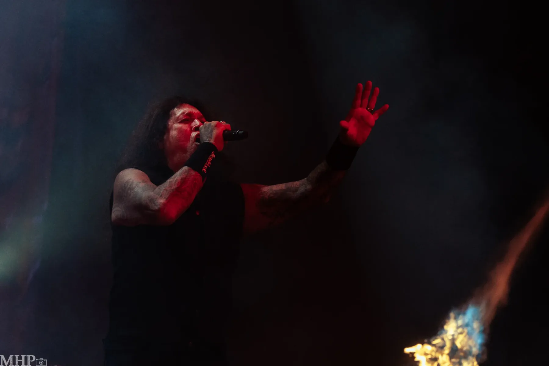 TESTAMENT führt uns schnell in die Anfänge ihrer Karriere mit dem schon fast hymnisch anmutenden ‚Practise what you Preach‘, und dem unerbittliche krachenden ‚Sins of Omission‘ – klassischer Oldschool-Thrash aus 1989. Chuck Billy ist einfach eine Erscheinung, wenn er sich vor dem Publikum aufbaut und mit seiner kräftigen gutturalen Stimme ins Mikrofon brüllt. Bekomme ich das Gänsehaut? Absolut. Die Setlist zeigt uns die Breite des Repertoires der Band – so ziemlich jedes Album von TESTAMENT ist hier vertreten.