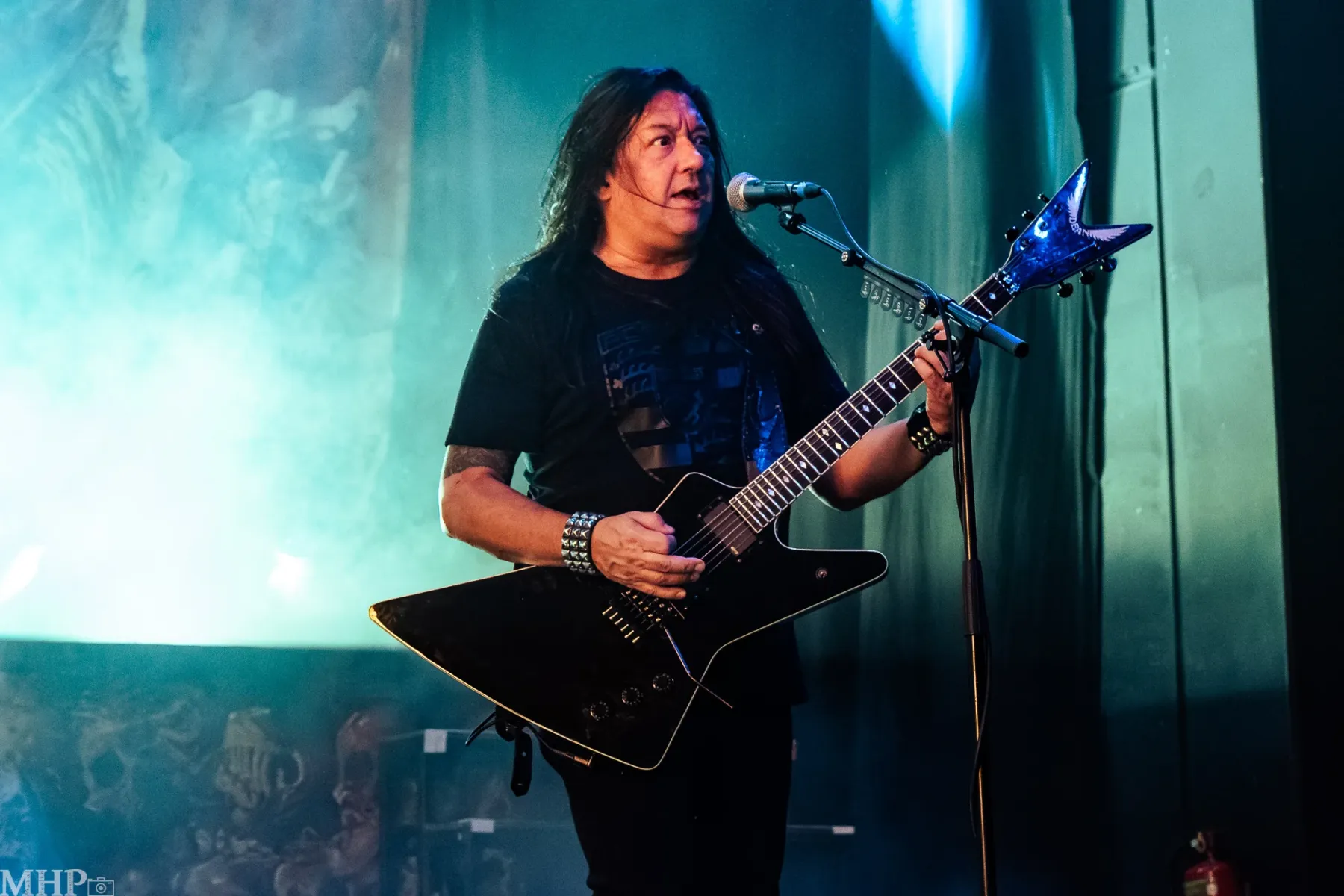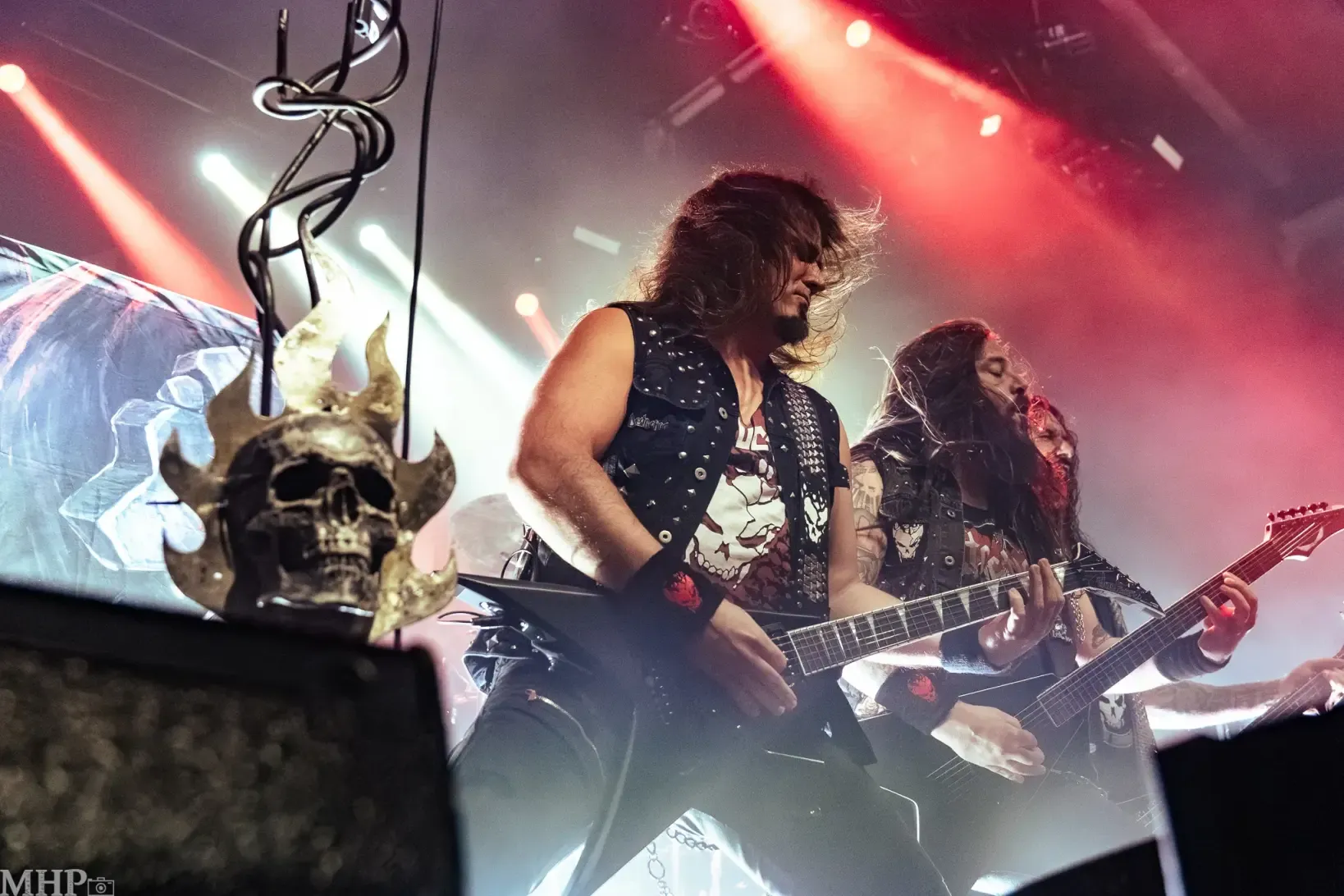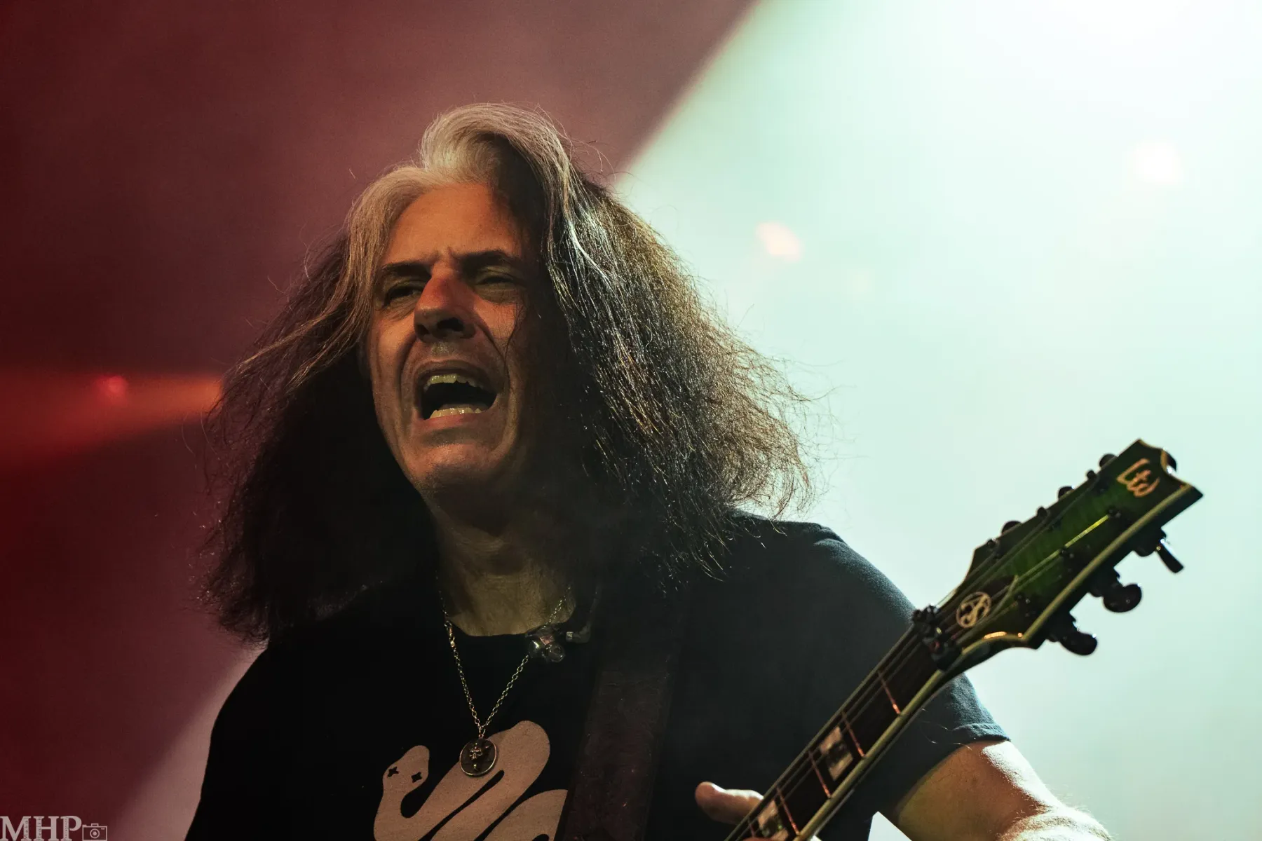 Besonders die beiden Gitarristen Eric Peterson und Alex Skolnick lieferten sich ein musikalisches – nennen wir es – Duell, das die Gegensätze der Band perfekt hervorstehen lässt: Peterson übernahm mit seinem schweren, und treibenden Rhythmusspiel die Rolle des Soundfundaments, während Skolnick mit seinen filigranen, emotional aufgeladenen und hervorragenden Soli nicht nur einen Höhepunkt setzte. Wie Zahnräder in einem gut geölten Uhrwerk, so arbeiten auch diese beiden Gitarristen zusammen – nicht nur vom Technischen wunderbar, diese Intensität geht auch unter die Haut.