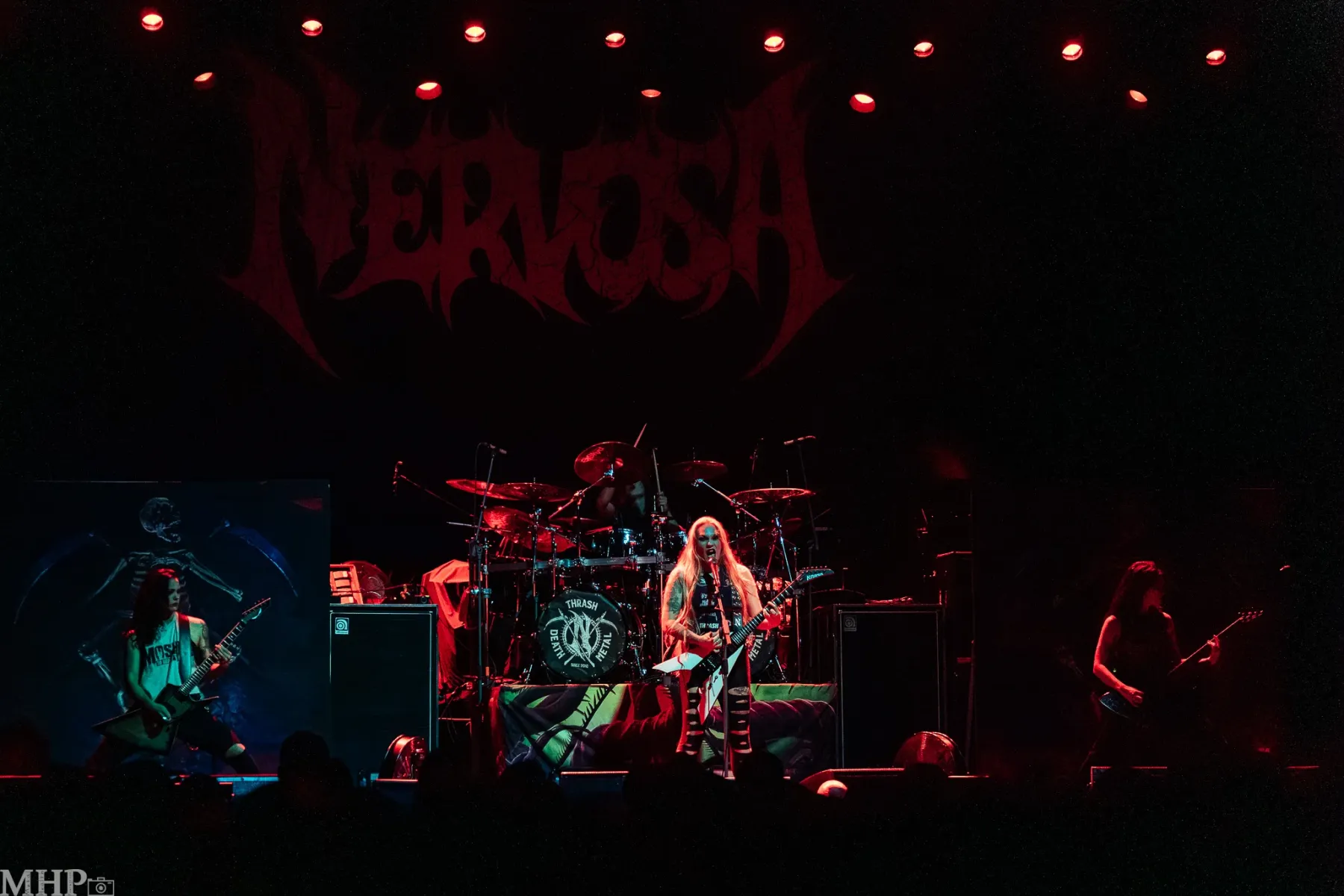 Nun geht auch endlich das Licht aus und das auf der Bühne an. Einzeln kommen die Damen der brasilianische Thrash-Metal-Band Nervosa unter lautem Jubel auf die Bühne und legen so gleich mit harten Riffs und melodischem Drumming einen gekonnten Start hin. Wenn dann Sängerin und Gitarristin Prika Amaral mit ihrer rostigen Stimme in die Menge brüllt, sind dann auch die letzten Augen auf die Bühne gerichtet.