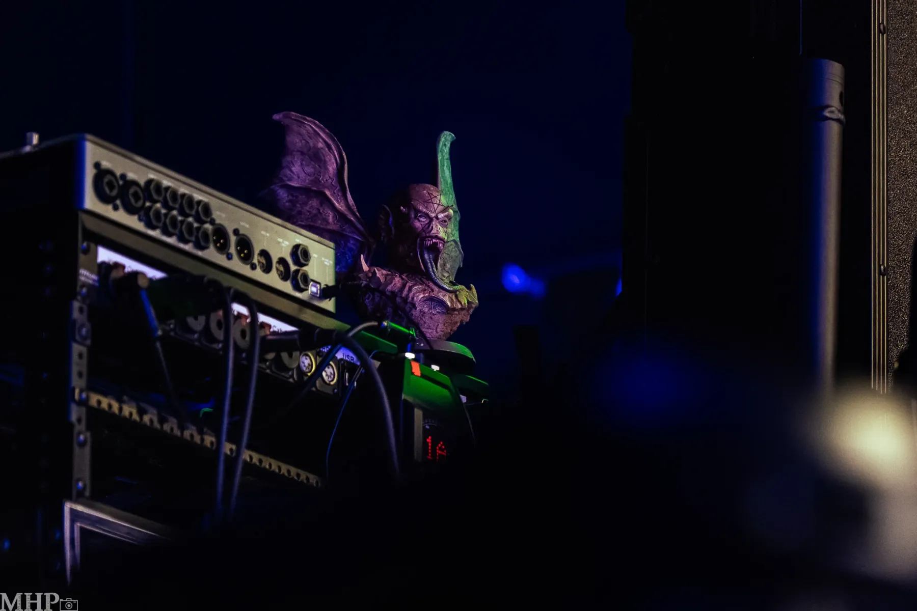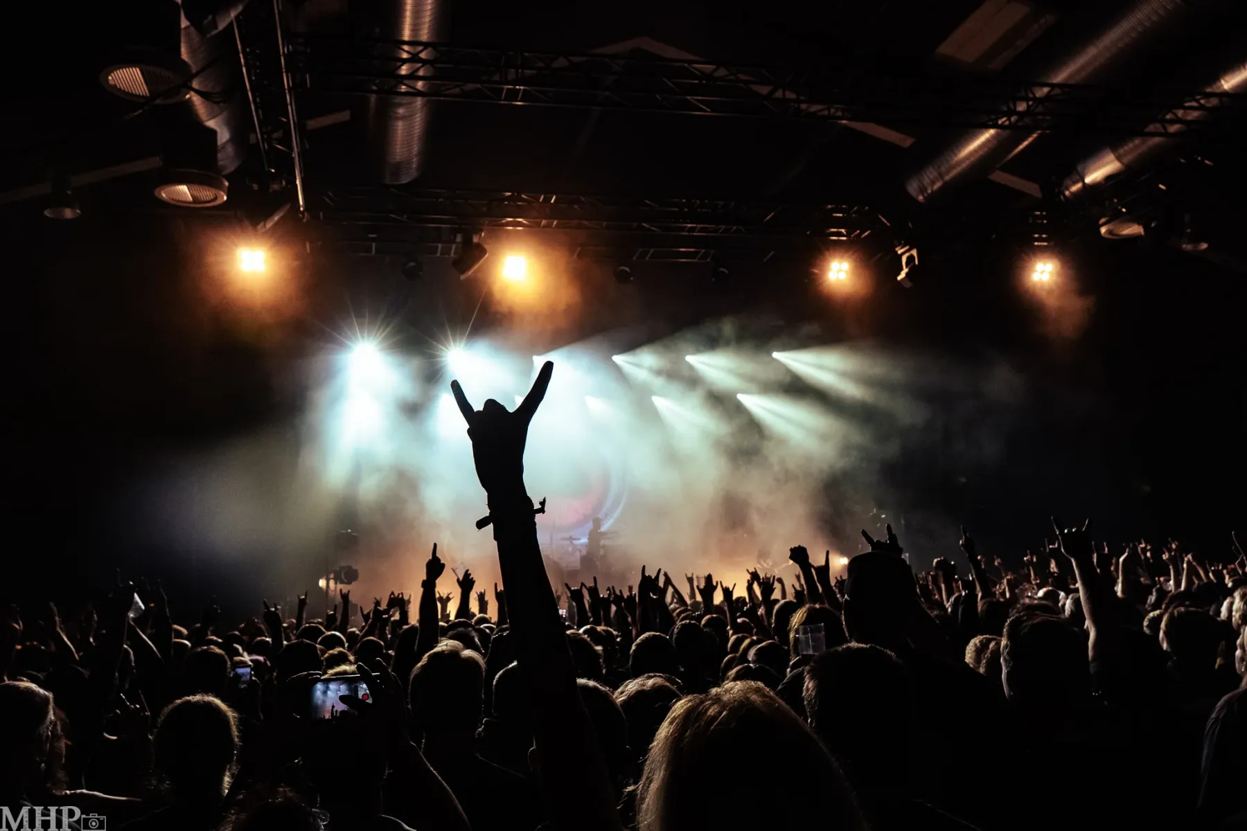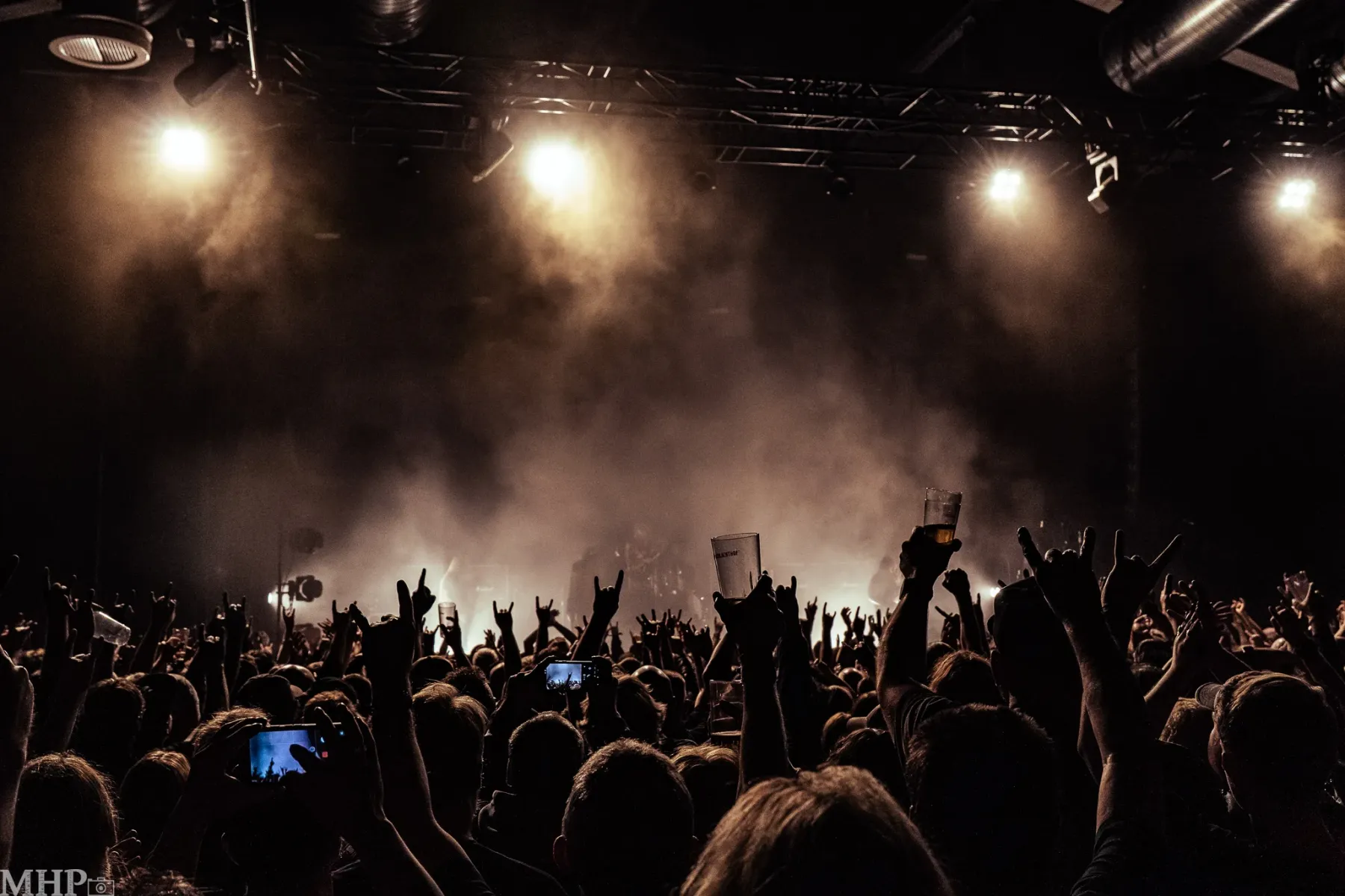 Nachdem man draußen schon die ersten bekannten Gesichter getroffen hat, geht es dann auch direkt – mit etwas zu trinken – in die erste Reihe. Zumindest für mich, denn der Fotograf an meiner Seite positioniert sich derweil schon mal am heutigen Arbeitsplatz. Die Halle füllt sich schnell; ich würde sagen, nicht ausverkauft, aber sehr gut besucht. Viele Kutten sind zu sehen und von alt bis jung ist hier auch alles vertreten – so mag ich das.